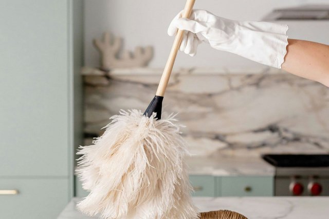 Начинайте чистить поверхности в следующем порядке: потолочные плинтусы, светильники (включая лампочки), стены, остальная отделка и плинтусы. Лучшими помощниками станут швабры с насадкой из микрофибры, щётки для пыли с телескопическими ручками или дезинфицирующие чистящие салфетки.