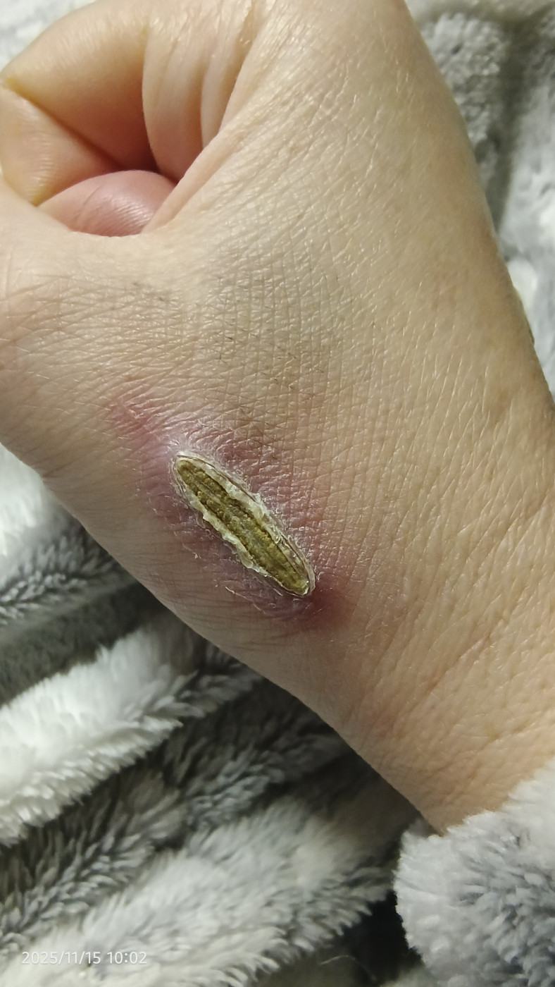 Здравствуйте! Поцарапала руку, когда убирала участок. Прошло 2 недели, из тоненькой царапины образовалась такая болячка. Мазала Левомеколем на ночь, днем руки часто в воде.