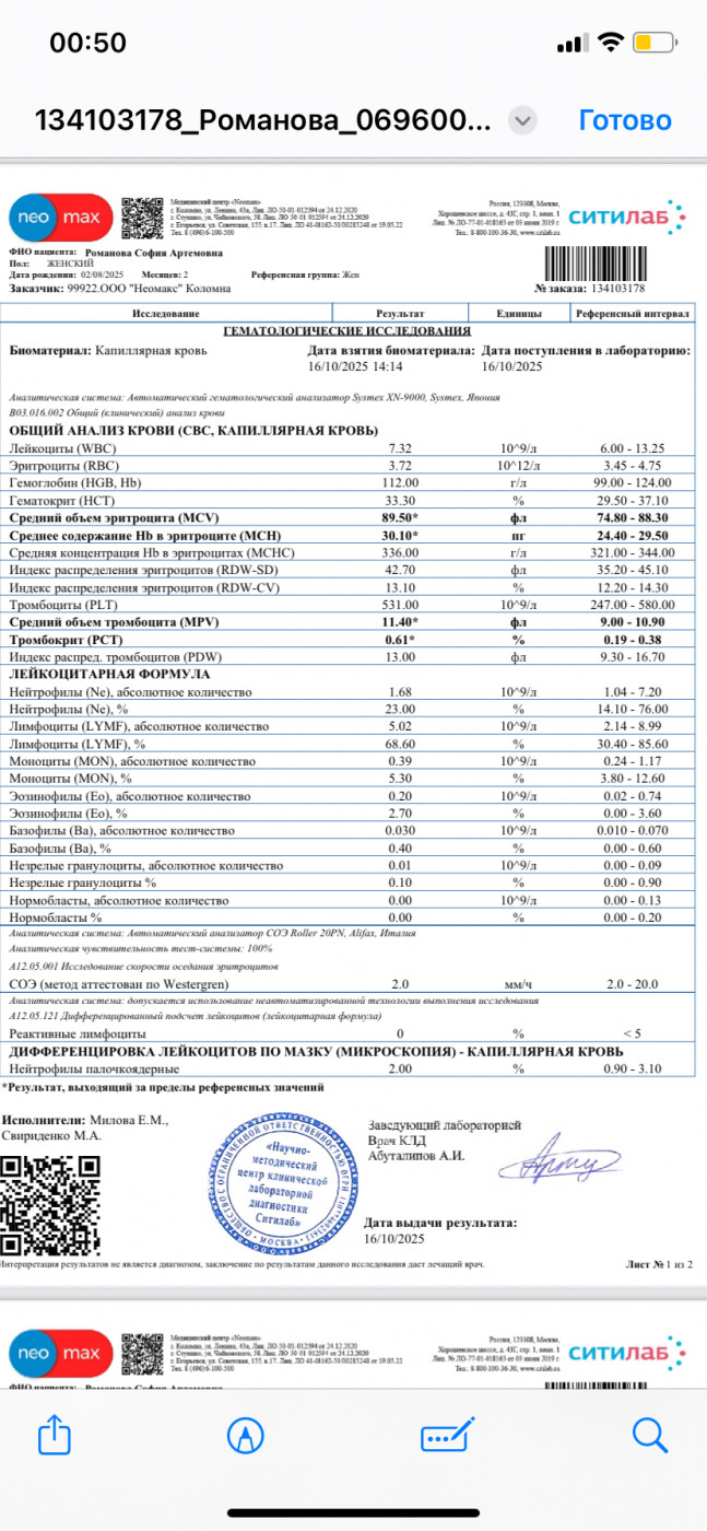 Добрый день.Сделали дочери(11месяцев) общий анализ крови,там два результата ниже нормы:Средний объём эритроцита (MCV) 73,1и Среднее содержание гемоглобина в эритроците(MCH)23.8-это все ниже нормы.Что это значит и что нужно делать?Жалоб нет.Спасибо большое.