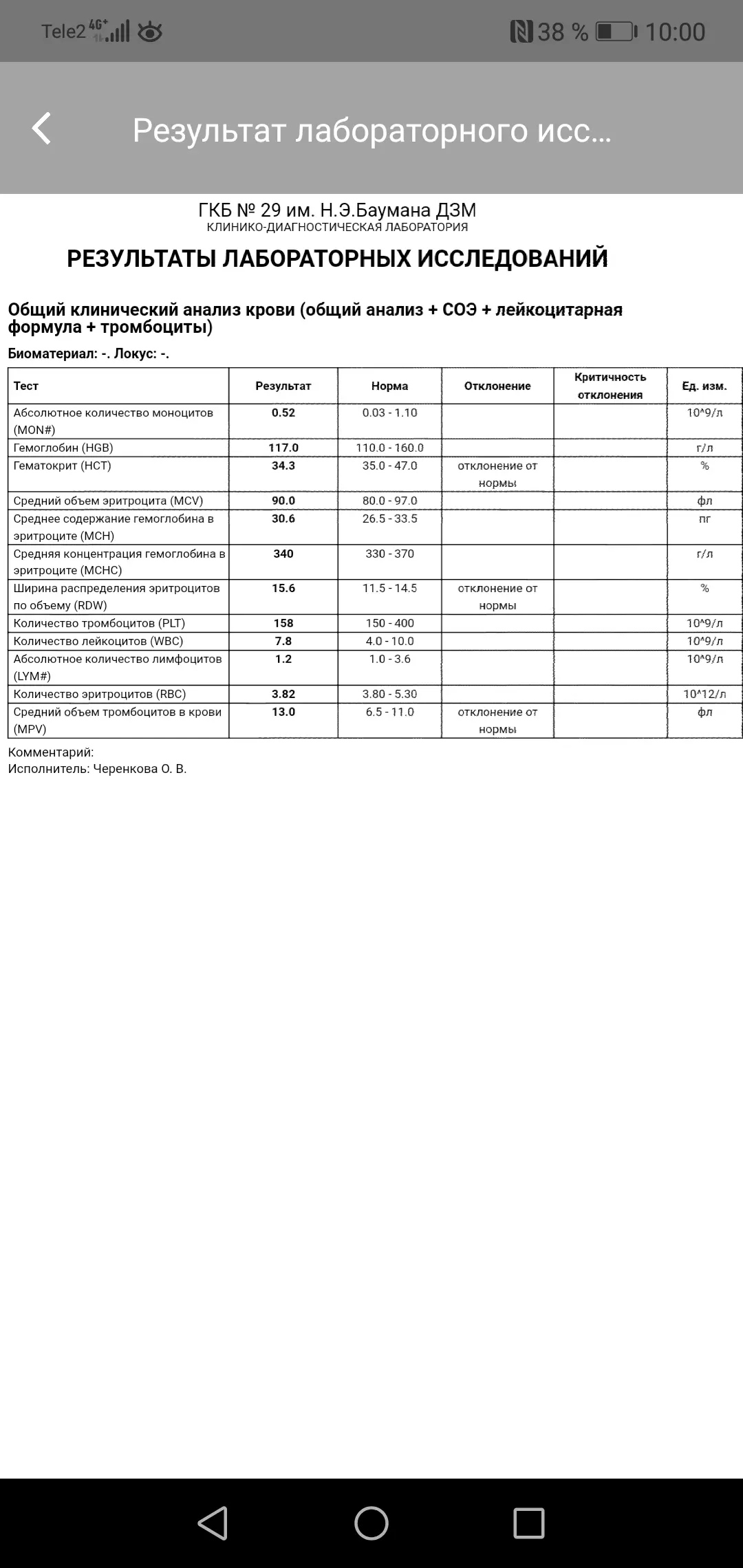 Здравствуйте. Снижен гемоглобин, вероятная железодефицитная анемия. СТоит сдать анализ на железо, ферритин, решить вопрос о назначении препаратов железа. Снижены тромбоциты, причину нужно уточнять. Для полноценной интерпретации результатов обследования необходимо иметь всю информацию, в том числе данные анамнеза, жалобы, клиническую картину, данные других анализов и обследований. |