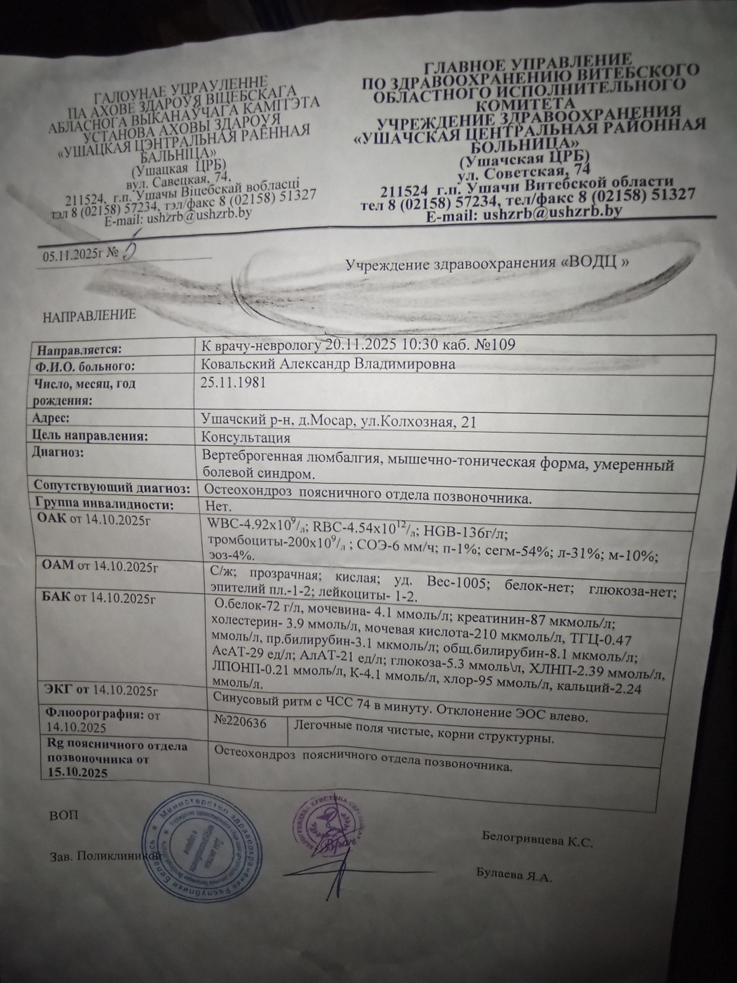 Здравствуйте! Мне 63 года.Мучают практически постоянные боли в спине.Врачи ставят диагноз "остеохондроз", лечат, но ничего не помогает. Пыталась возражать, объяснять...да кто будет слушать! Боли блуждающие, то справа, то слева, то лопатка, то ниже. Это продолжается более 20 лет.Спасаюсь только иппликатором Кузнецова, шью себе их из плотной ткани, с… |