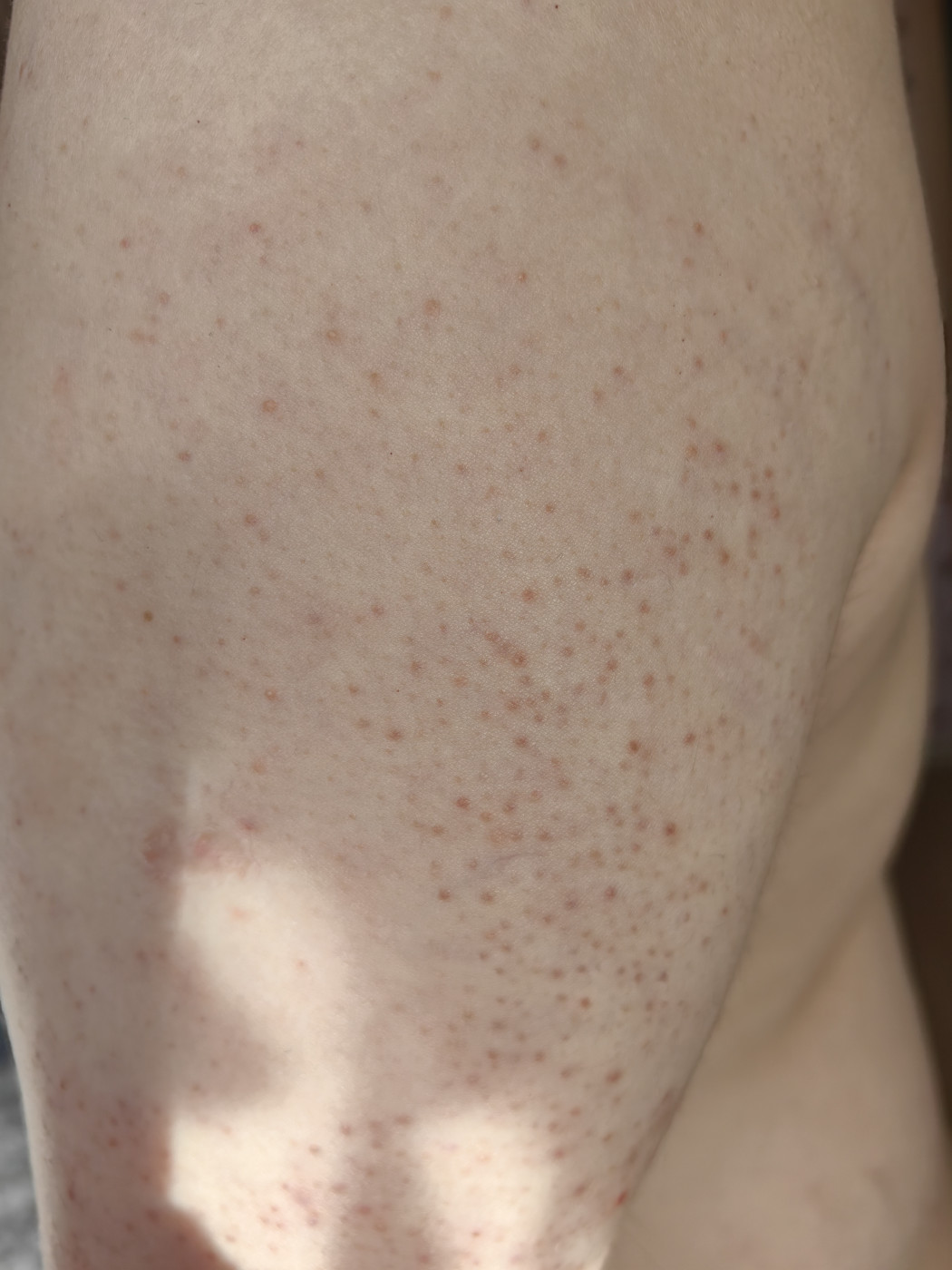 Болючие красные высыпания на внешней стороне бедра и спинеЗдравствуйте, на внешней стороне бедра появилось высыпание, 5 красных прыщиков, они не чешутся, но если нажать то болят. Потом похожие высыпания появились внизу спины. А сегодня на ноге возле первого высыпания появилось небольшое такое же. Улучшения на первом высыпании не видно, оно как было три дня назад, так и осталось. Подскажите, что это может быть и как вылечить? Спасибо. |