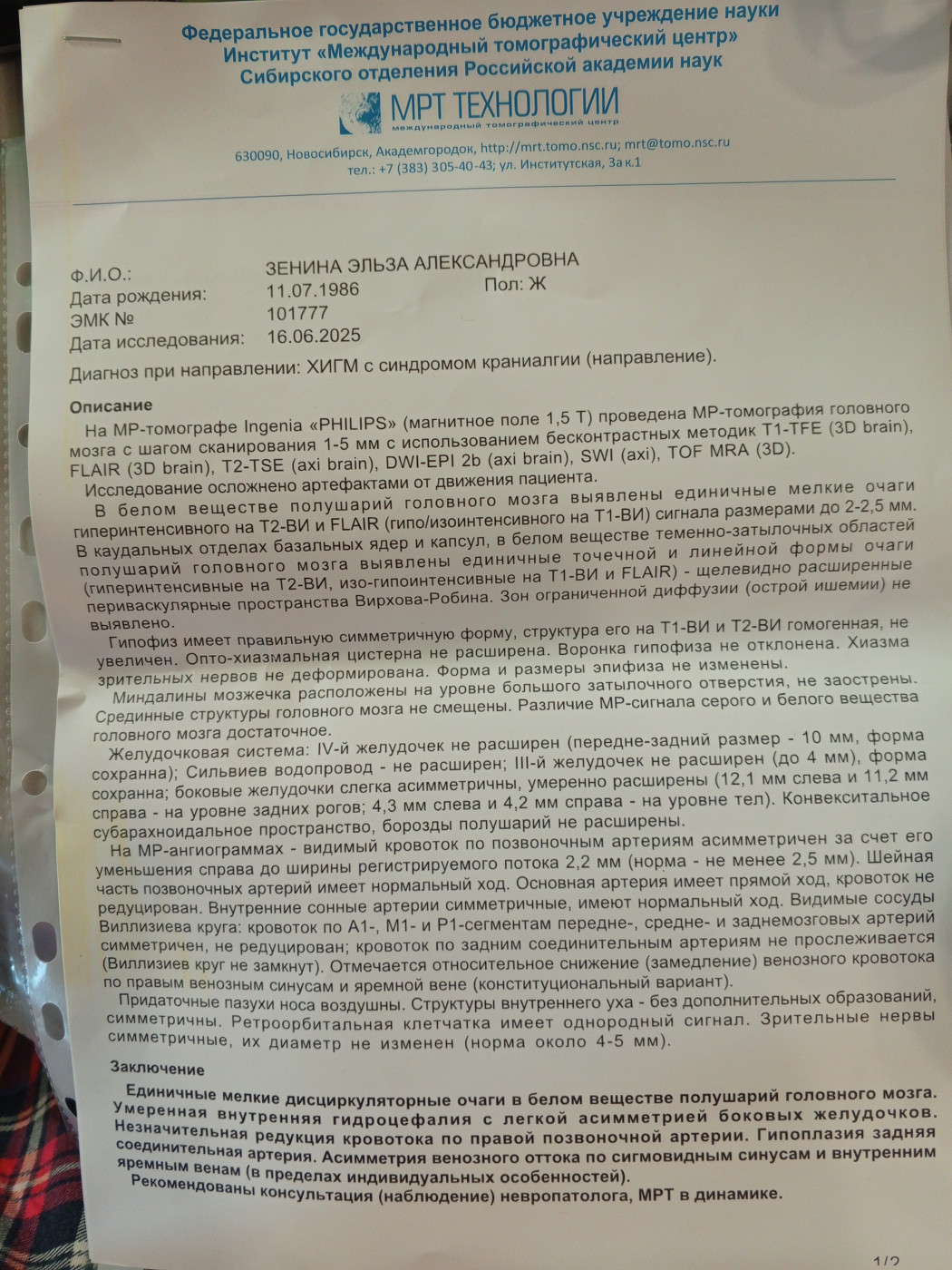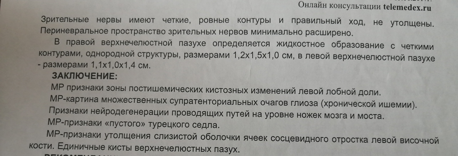 Были сильные головные болиМне 38л, сильные головные боли. Невролог назначил обследование, которое выявило Ишемию головного мозга. Назначили, Пикамилон, Мексидол и Магнезию внутримышечно 5 дней. Эффекта нет, головная боль не проходит. Сделала МРТ.  |