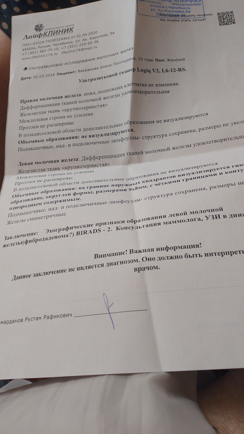 Расшифруйте УЗИБолит левая грудь сходила на УЗИ сказали есть уплотнение в 9 мл BIRADS2 |