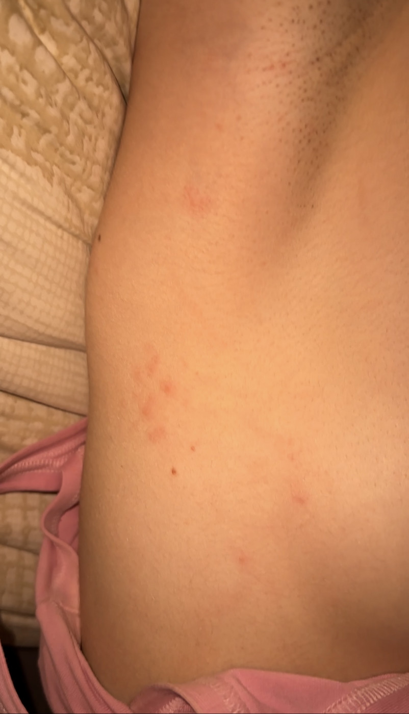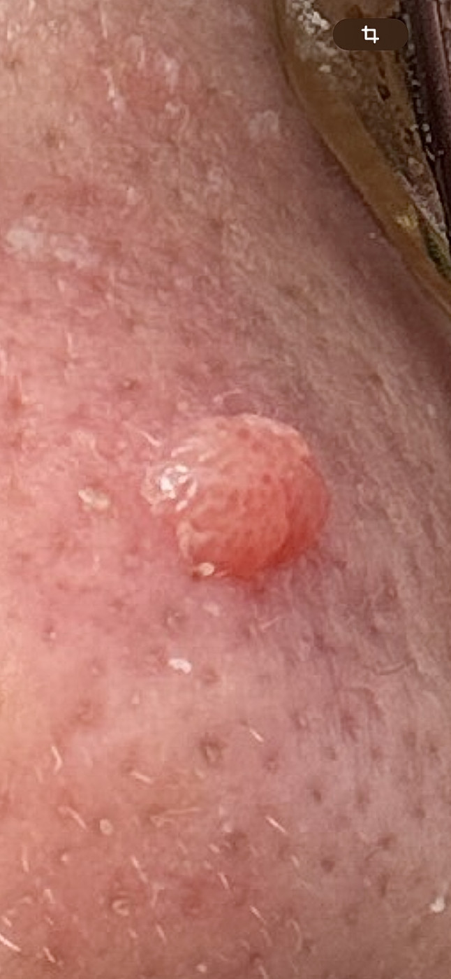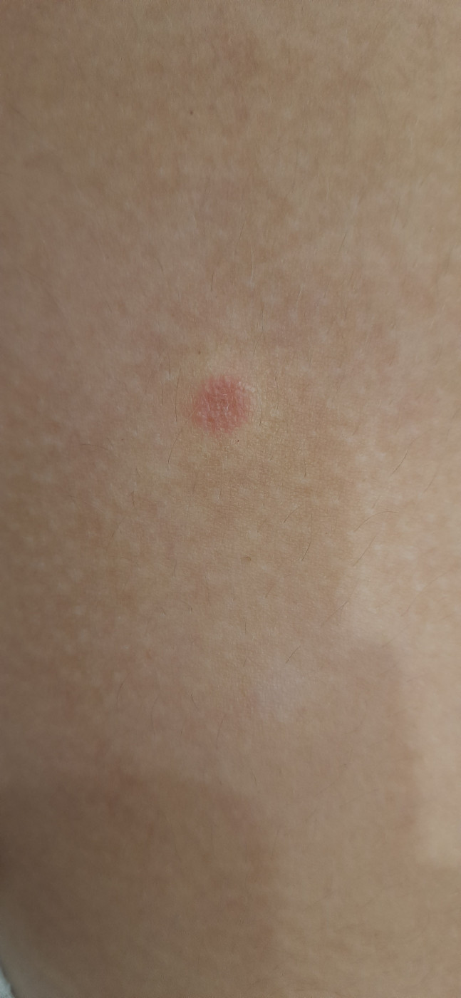 Здравствуйте! Неделю уже странные проявления на коже рук, на обоих. Сначала появляется бугорок (штуки 2-3) под цвет кожи, чешется секунды три, затем когда почешу проявляется этот бугорок уже красным, когда притрагиваюсь болит чуть чуть. А на следующий день или через несколько часов становится уже как твердый засохший прыщик. Что это может быть? На первом фото, когда только проявился, а на втором, обозначенным ручкой - когда уже засох