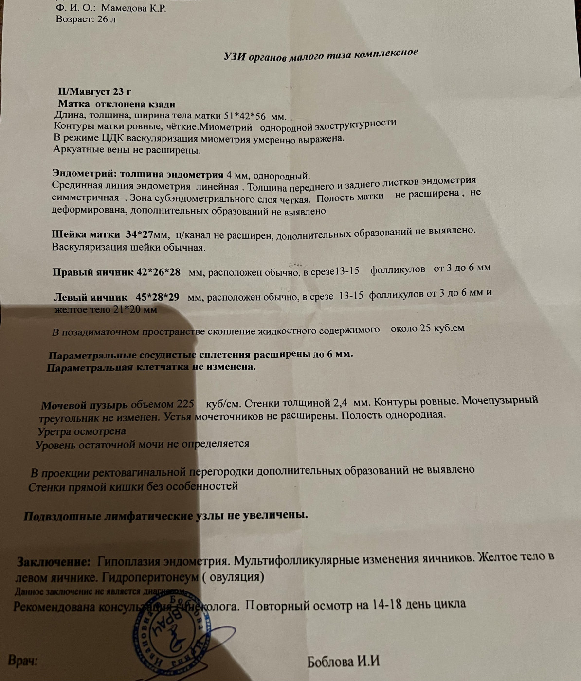 здравствуйте. у меня спкя на фоне инсулинорезистентности. пью метформин. цикла нет. т.к. месячные пропали совсем. приходят только на дюфастоне. яичники 3 месяца назад были размером : правый 6,3 ×4,1×3,6 левый 8,1×3,8×5,3 фолликулов до 26 в срезу в обоих. д- 25. эндометрий 7 мм. повышены андрогены. гинеколог назначила циклодинон на 3 месяца и витамины.… |