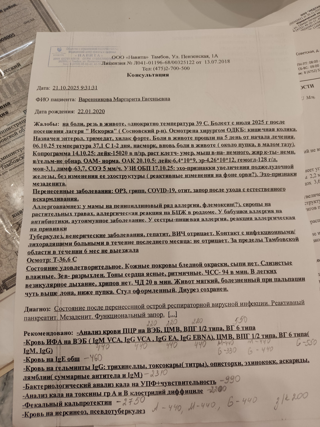 Эхо признаки мезаденитаЗдравствуйте. Ребёнок переболел насморком. После двух недель начал жаловаться на живот. Потом снова заболел насморком. Отболели. Сделали оам и оак и сдали кардиограмму с узи. Поставили по узи эхо признаки мезаденита. Ребенок жалуется на сваткообразные боли ближе к ночи и утром. Состояние обычное. Были на приёме у инфекционниста ничего не сказали только пить ношпу и энтерол и сдать кучу анализов на 20 тыс. И не понятно нужны ли они вообще. Очень проблемно сдать тк у ребёнка большой страх. Ребёнку 5 лет 10 месяцев. Бывают часто запоры