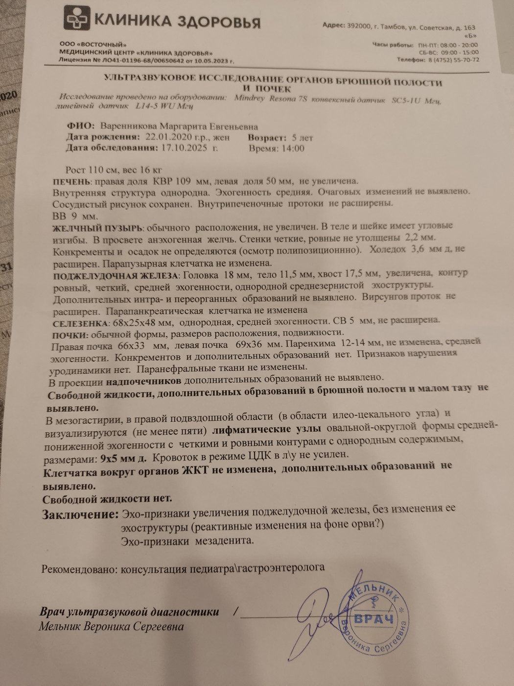 Добрый вечер! Ребёнку 6 лет. Жаловался на боли в животе в районе пупка. Сделали ужи брюшной полости, поставили функциональное расстройство кишечника, кишечные колики, мезаденит. Еще были увеличены лимфатические узлы в брюшной полости. Пролечились полтора месяца. Боли в животе прошли, стул наладился. Сделали повторное узи лимфоузлы опять увеличены. Сдали… |