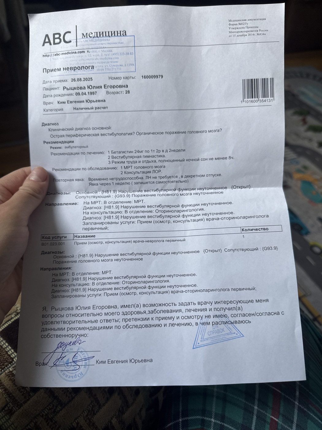 Головокружение: что это?Два дня назад вечером был жар но без температуры и закружилась голова После ночи это всё усилилось и стало ещё хуже так что я не могла ходить из за того что было сильное головокружение и рвотные позывы Вызвала скорую помощь Укололи Церукал и уехали Легче не стало Вызвала ещё раз скорую вкололи препарат разогнать кровь и убрать головокружение Немного прошло Но после ночи опять вернулось но уже с меньшей силой Пошла к неврологу После осмотра и разговора она поставила диагноз( прикреплю заключение в файлы) И попросила сделать МРТ Сделала Всё прикрепляю Как разобрать что написано в расшифровке МРТ? А то есть очень пугающие предложения В МРТ написано там контроль гормонального статуса Какие анализы можно сдать чтобы проверить что не так ? |