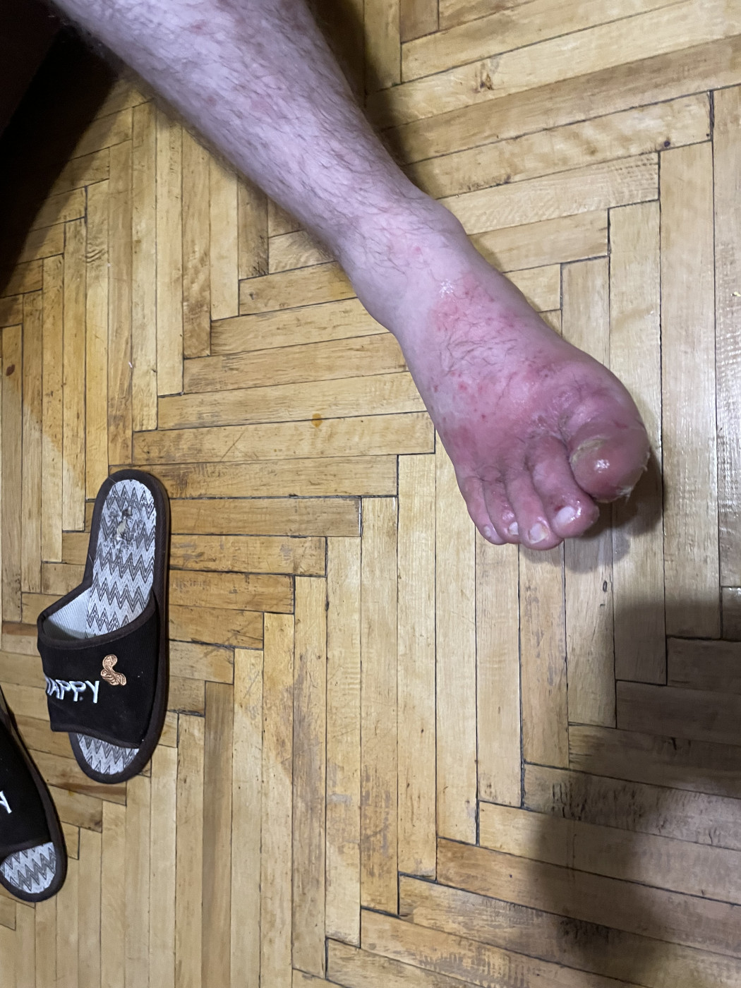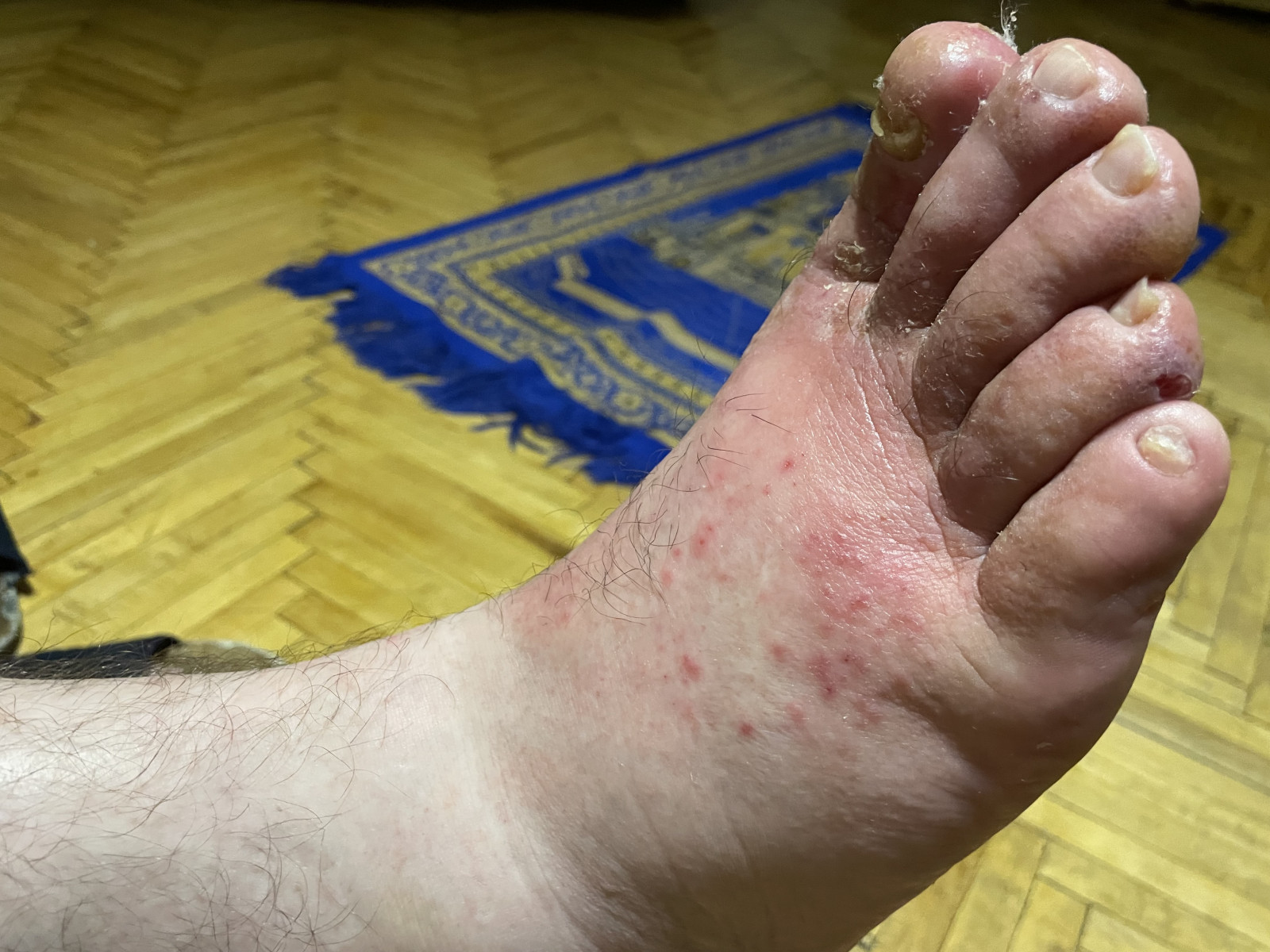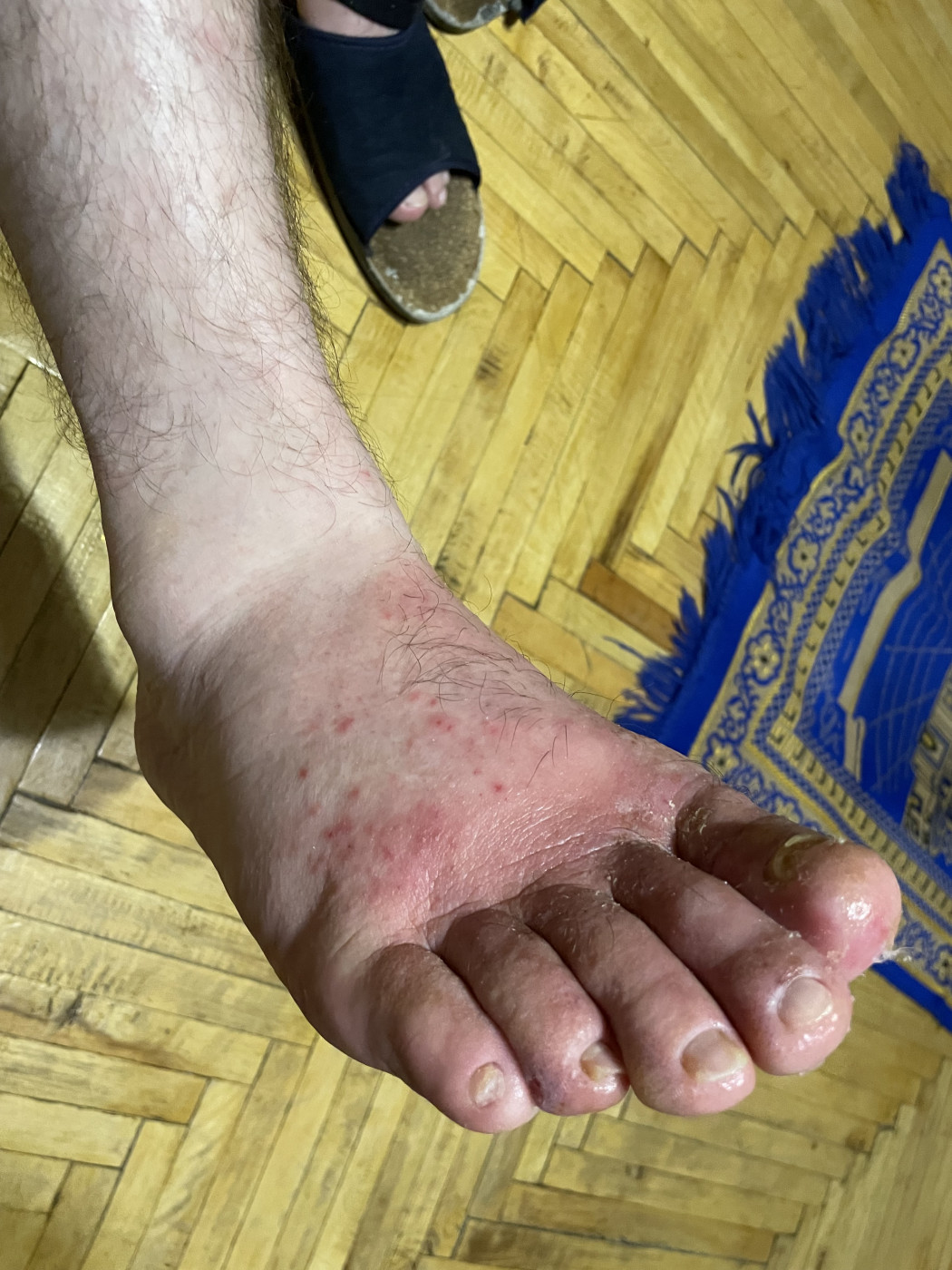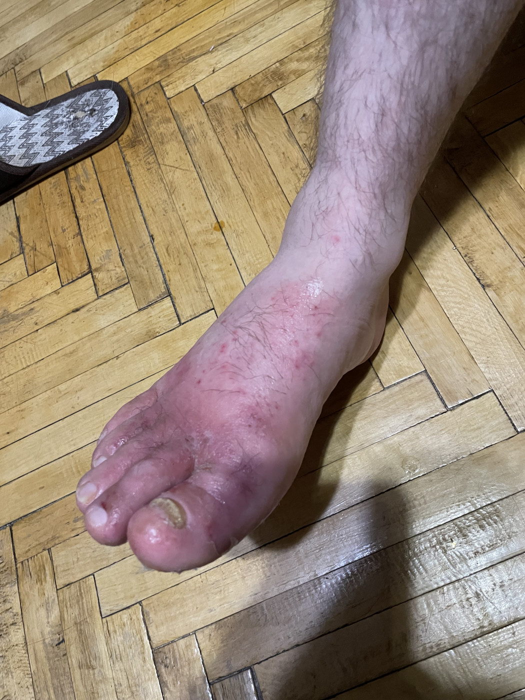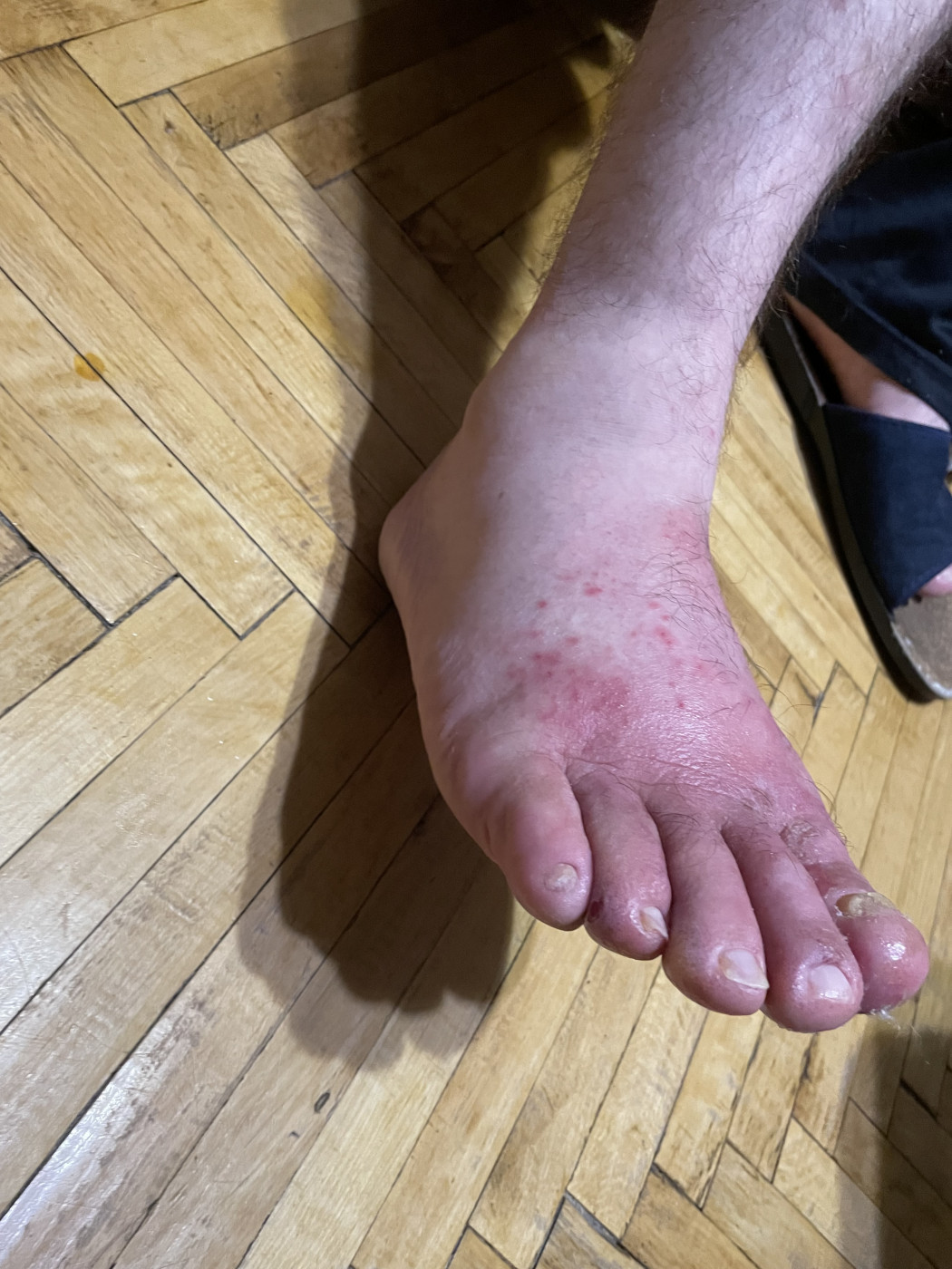 Подскажите что это может быть? Грибок? Недавно появились на ноге точки, как ранки, но не ппомню, чтобы чем то травмировала ногу. Очень чешется, большая ранка вокруг опухла и пркраснела, фото прилагаю. К какому врачу обратиться?