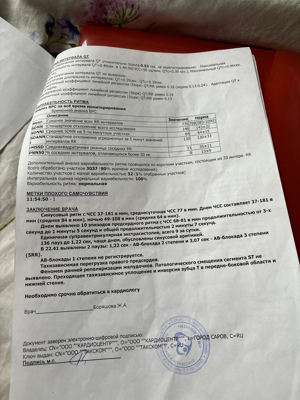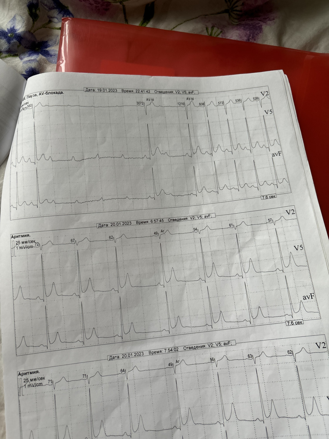 Эхо хорошее. Холтер переделала 3 раза. Блокад нет . |