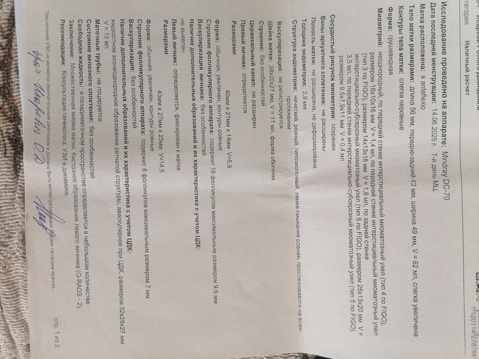 Добрый день! 25.11.2015 на компьютерном томографе в матке были обнаружены интрамурально и субсерозно, больше по передней поверхности множественные образования овоидной формы, с ровными и четкими контурами, максимальный размер которых 1,4 см в диаметре, накапливающие контрастное средство несколько слабее, чем миометрий. Правый яичник увеличен в размерах,… |