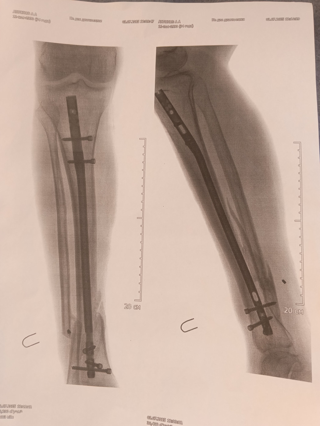 Когда можно начинать ходить после остеосинтеза костей голени?Здравствуйте. Хронических заболеваний нет, 40 лет. Диагноз — Закрытый перелом с-н/3, заднего края большеберцовой кости, подсиндесмозный перелом малоберцовой кости слева со смещением отломков. 30.05. 2025 проведена операция Закрытая репозиция, остеосинтез большеберцовой кости слева интрамедуллярным блокируемым штифтом, открытая репозиция остеосинтез малоберцовой кости слева пластиной, заднего края большеберцовой кости винтами. В шесть недель после операции сделала контрольный рентген ( снимков нет) Интерпретация результатов |