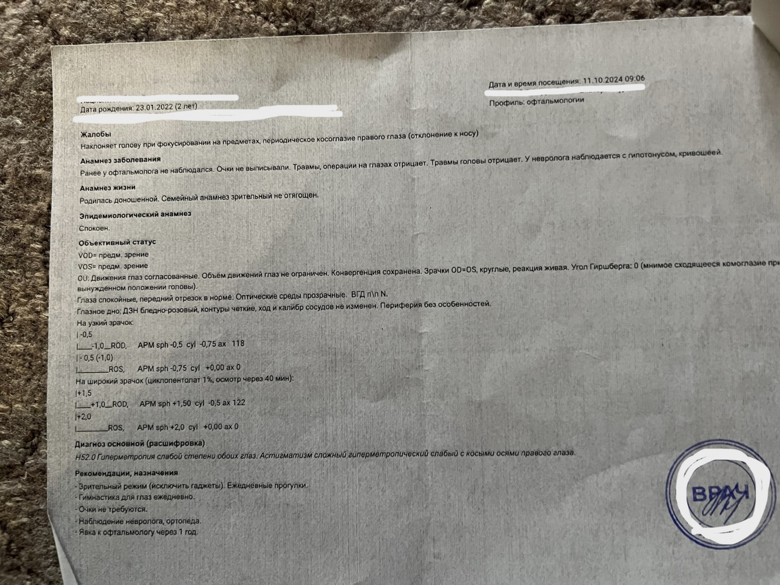 Косит глаз у ребенкаЗдравствуйте. Подскажите, пожалуйста, у ребенка 2.10 с момента поднятия головки появился наклон головы влево, который не проходит после курсов массажей, физиотерапии. При наклоне головы вправо правый глаз уходит вверх, когда ребенок фокусирует взгляд глаз встает нормально, но как будто начинает щурится. Может ли быть наклон головы из-за проблем с глазами ? Осмотр врача прилагаю |