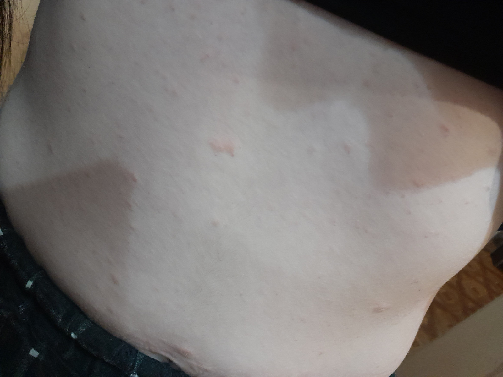 Появились пятна на теле, в основном на руках. Похожи на маленькие прыщики или укусы комаров, небольшой зуд, судя по картинкам в интернете, на дермотит, лишай и чесотку не похоже