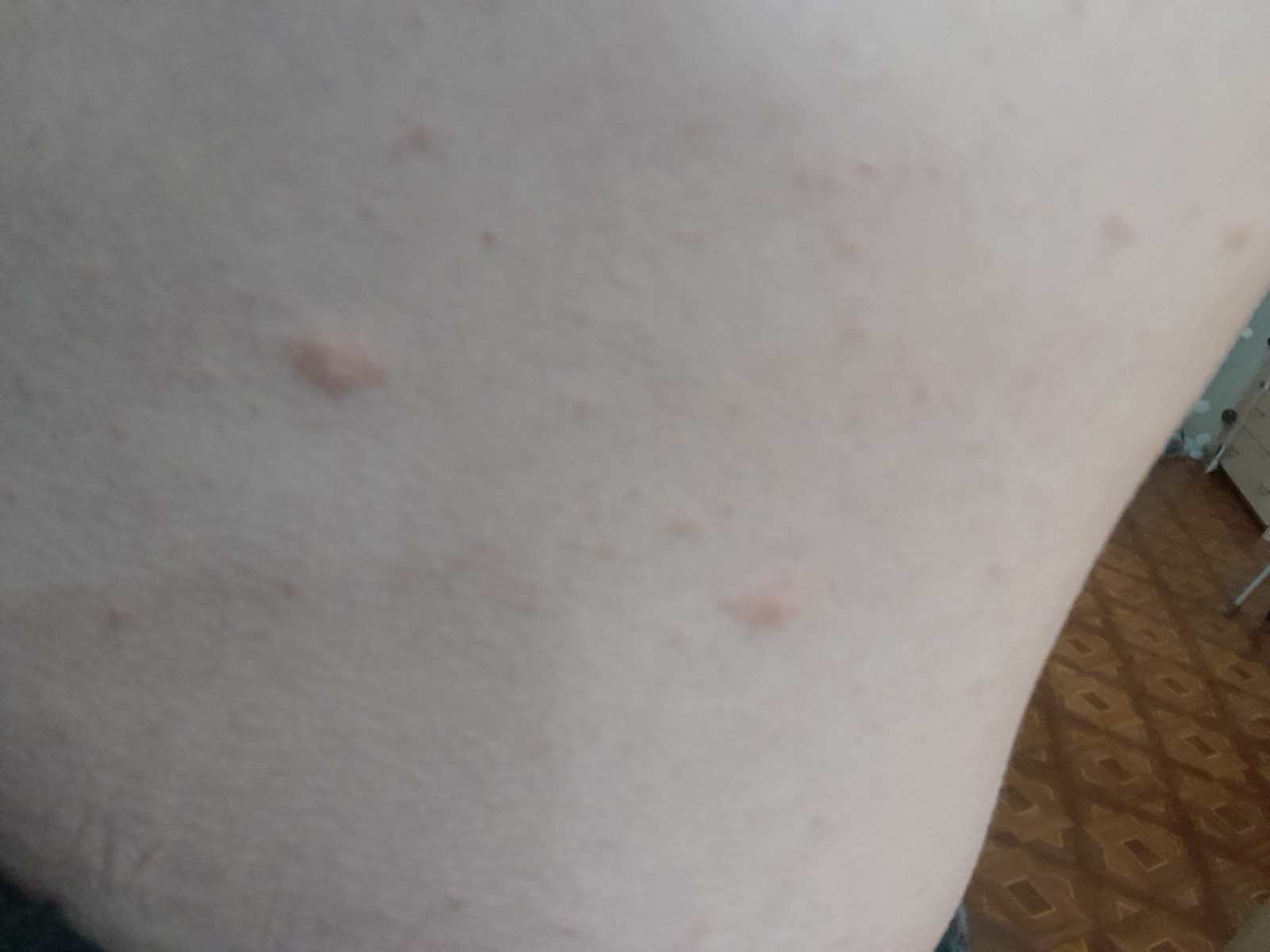 33 мужчина. В начале на спине в районе левого бока появилось два очага сыпи,похожих на ожог крапивы,без гнойников и нарывов. Один очаг из нескольких розоватых прыщиков диаметром примерно 1см, второй очаг рядом немного меньше. В течении двух-трёх дней очаги значительно увеличились в диаметре до 4см первый, 3см второй. Присутствует небольшой зуд. Из лекарственных… |