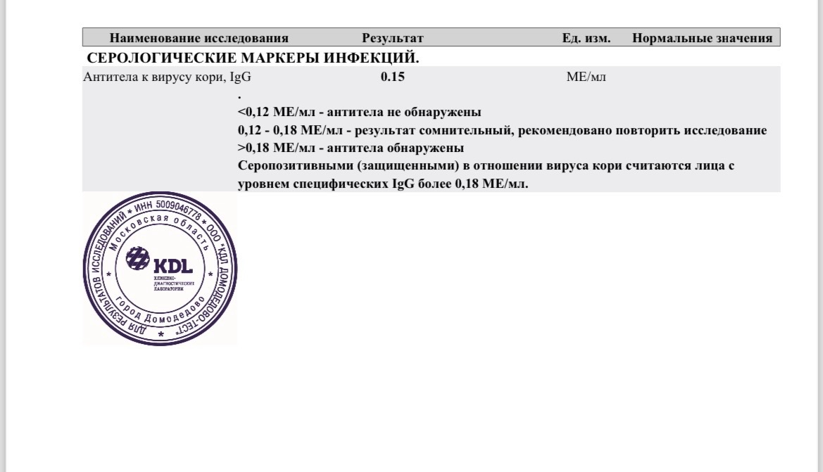 Добрый день! Скажите пожалуйста делала анализ на антетела к вирусу кори IgG. Результат 0,02 ME/мл. Отрицательный(