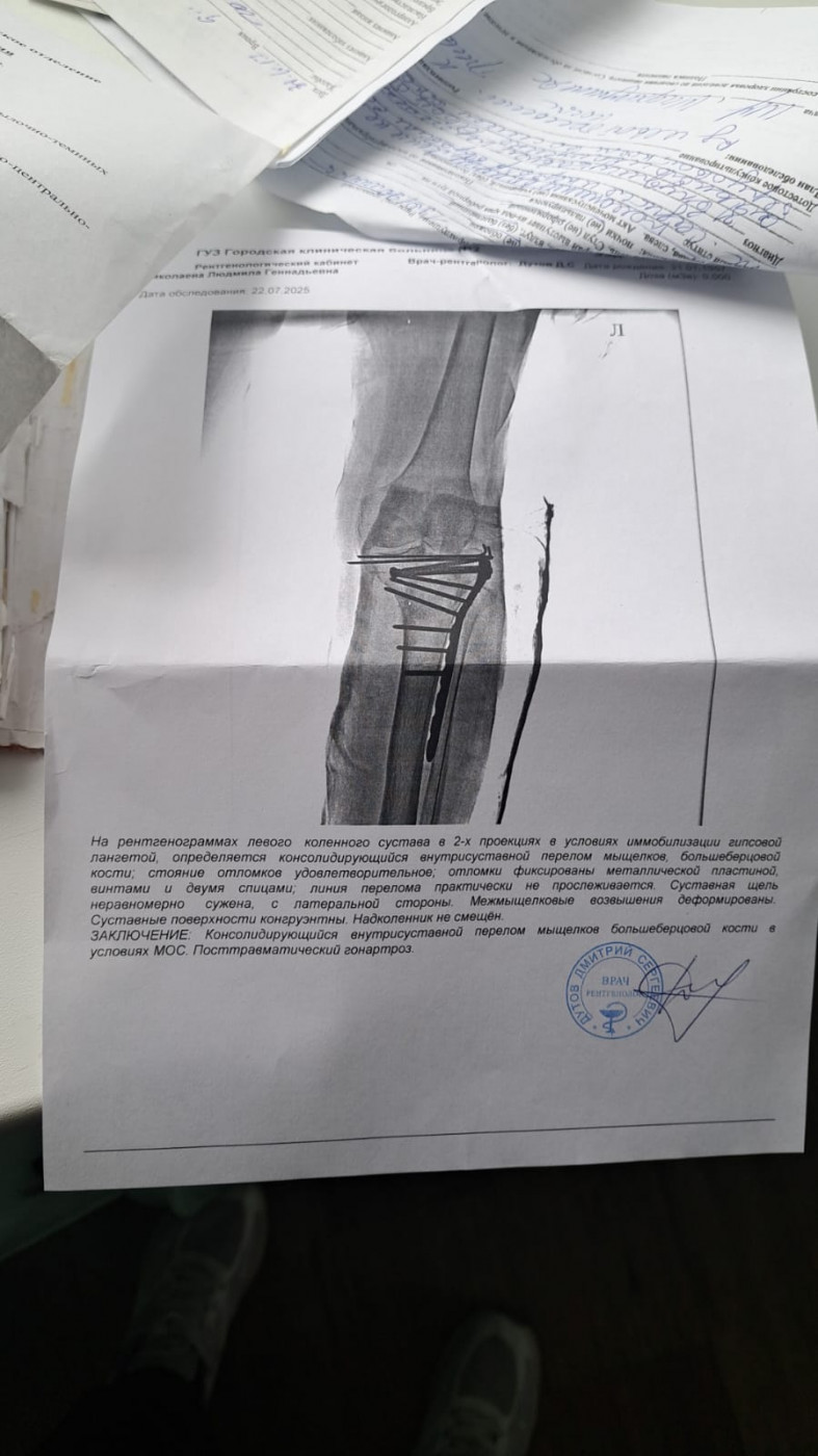 Можно ли снять гипс?Здравствуйте. Я 11.04.25. сломала левую ногу. Лежала в больнице. Диагноз Перелом проксимального отдела большеберцовой кости закрытый. Закрытый внутрисуставной перелом медиального мыщелка левой большеберцовой кости со смещением отломков. Гемартроз. |