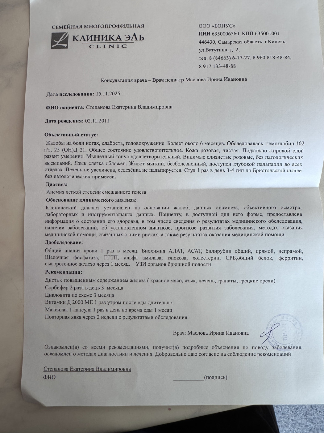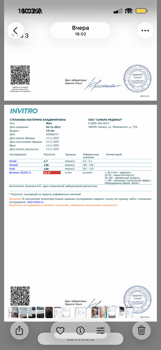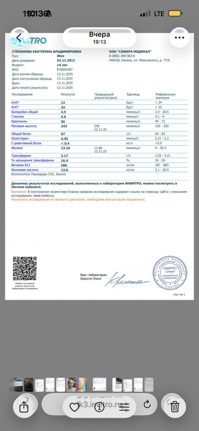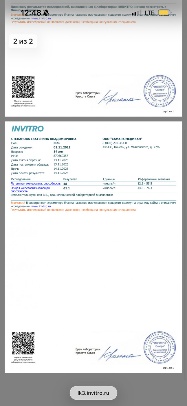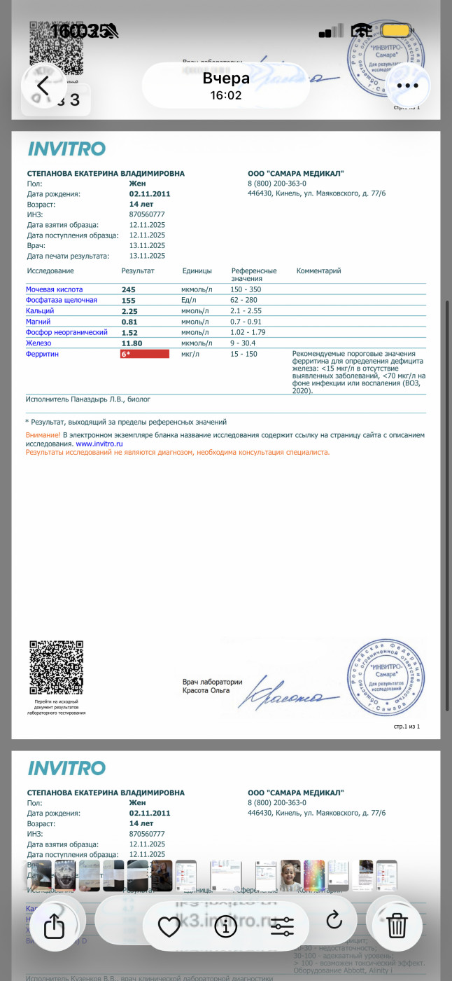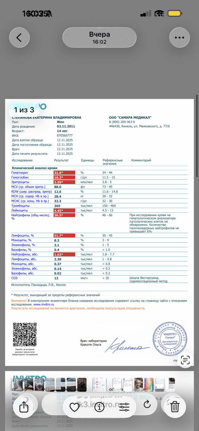 Можно заподозрить лейкоз?Здравствуйте! Дочь 14 лет, понижены показатели в крови гемоглобин , гематокрит, эритроциты , лейкоциты,нейтрофтлы и ферритин . Начну с начала у нее пришла первая менструация в июне 24го года, с циклом проблемы , ставят гиперплазию , эндометрий наростает и не отторгается , то приходили то нет, иногда несколько раз в месяц подкравливала , в феврале 25го весь месяц кровила, в итоге по узи эндометрий был 20, вызывали дюфастоном, и как пришли положили в стационар останавливали кровотечение, в первый день ушло 6 ночных прокладок, и вообще прилично шли 5 дней при том что останавливали кровоостанавливающим . После стационара через некоторое время дочь начала жаловаться на то что у нее мутнеет в глазах, кружится и болит иногда голова , но вот недавно еще походу состояние усугубилось тем что она 2 месяца усердно тренировалась (конец сентября и весь октябрь), маршировала (она кадет) , не высыпалась и кушала плохо, и вот чуть позже после начала тренировок начала жаловаться что сводит ноги , и сейчас жалуется что у нее болит нога под коленом спереди , как кость . Сегодня пожаловалась что когда купалась нагнулась и у нее вступило в пояснице.После жалоб решили сдать анализы и вот что пришло, прикреплю. В стационаре взяли кровь только при поступлении было норма (при выписке не брали), тоже приложу . С чем связано такое изменение в крови, и то что на ногу жалуется страшно подумать за лейкоз , подскажите какие бы были изменения, и по нашим можно заподозрить?забыла указать что анализы сдавали через 3 дня после окончания менструации. Нам назначено сорбифер 1 таб 2 раза в день , Вит д, Вит в, по жкт желчегонное и канефрон |