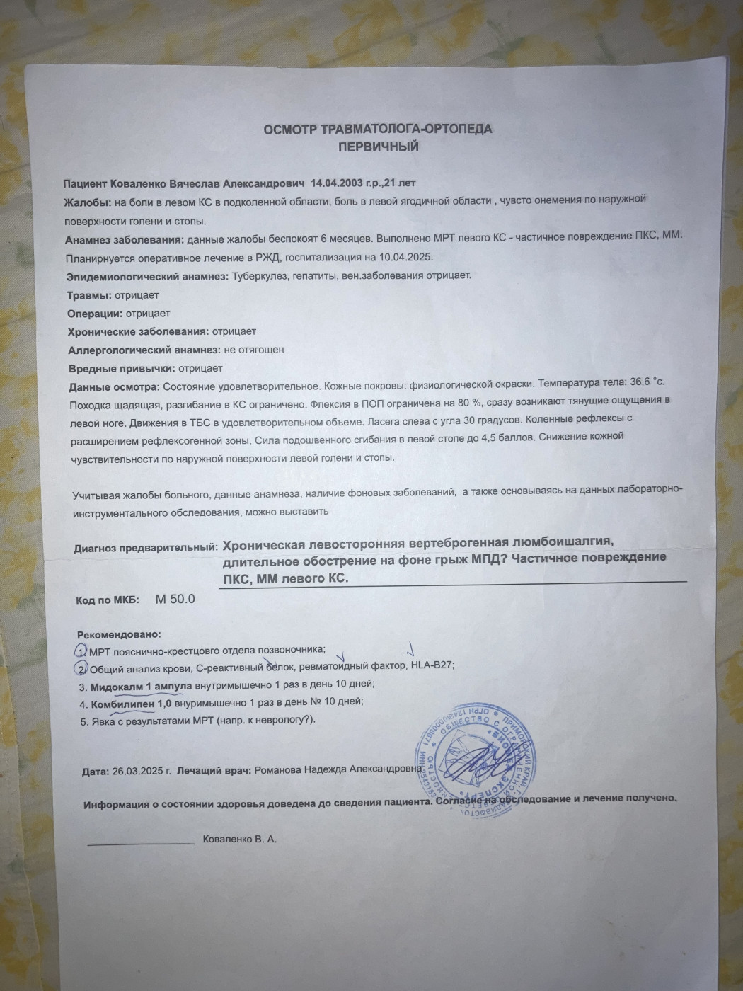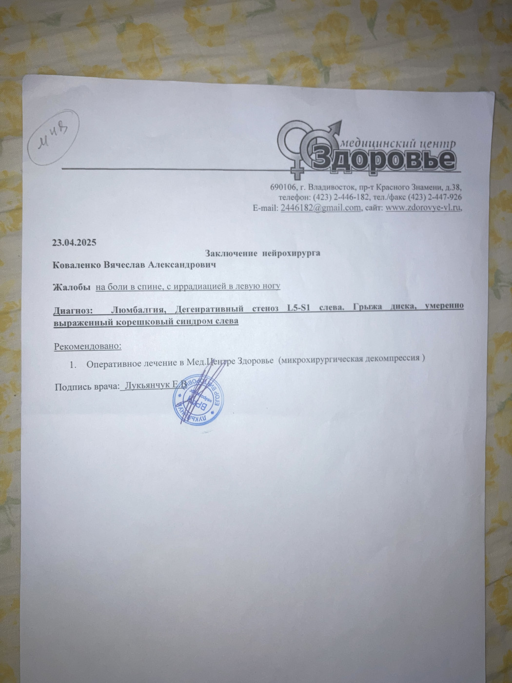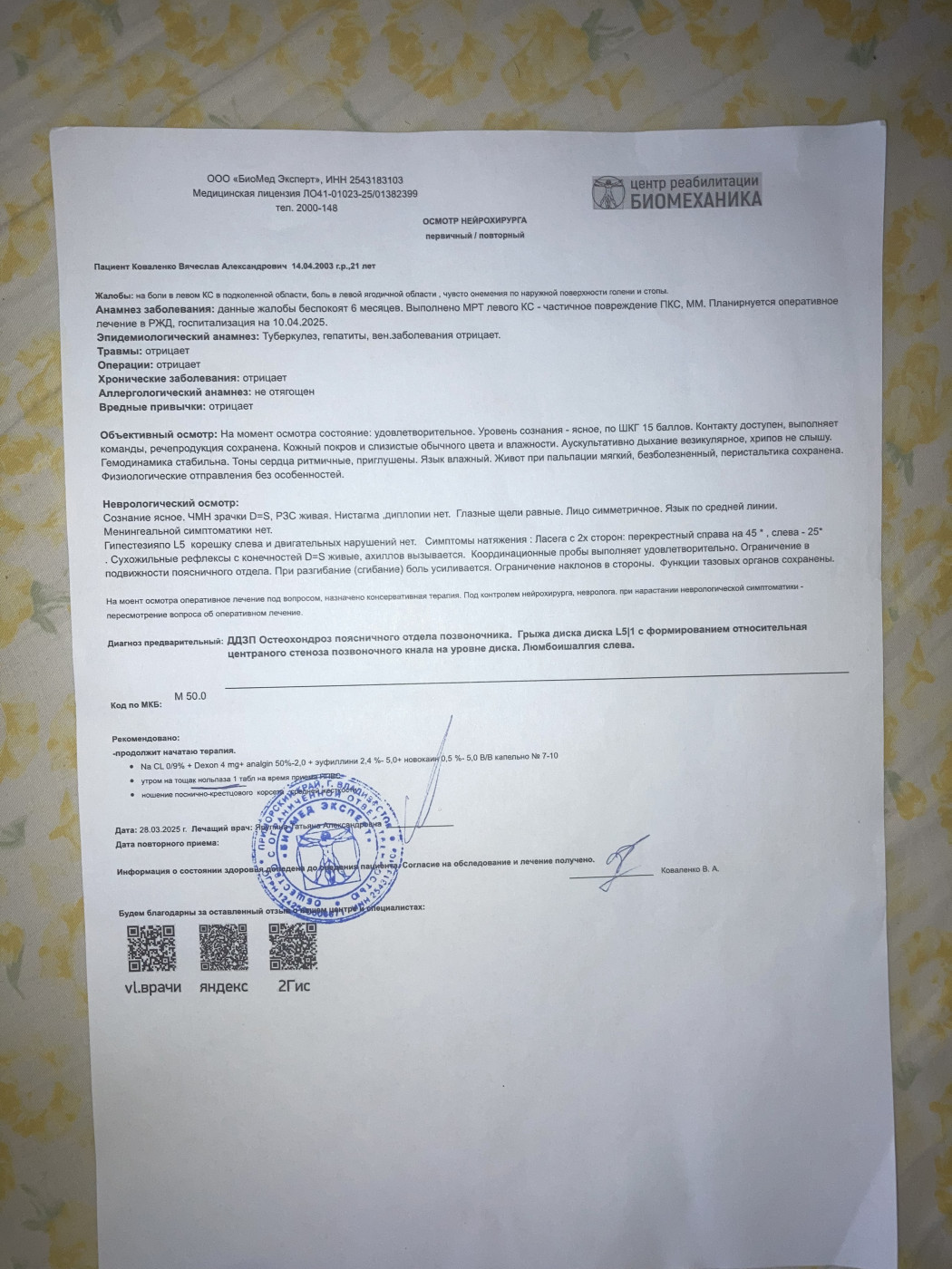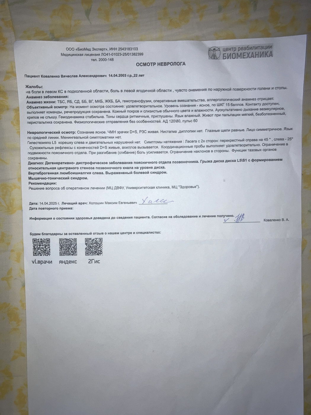 Здравствуйте, доктор. Я сделал МРТ пояснично-крестцового отдела позвоночника и получил заключение: МР-картина дегенеративно-дистрофических изменений пояснично-крестцового отдела позвоночника. Грыжа диска L4-L5 шириной до 7 мм, компремирующая левый нервный корешок. Задние диффузные протрузии дисков L2-L3 шириной до 2 мм, суживающие переднее эпидуральное… |