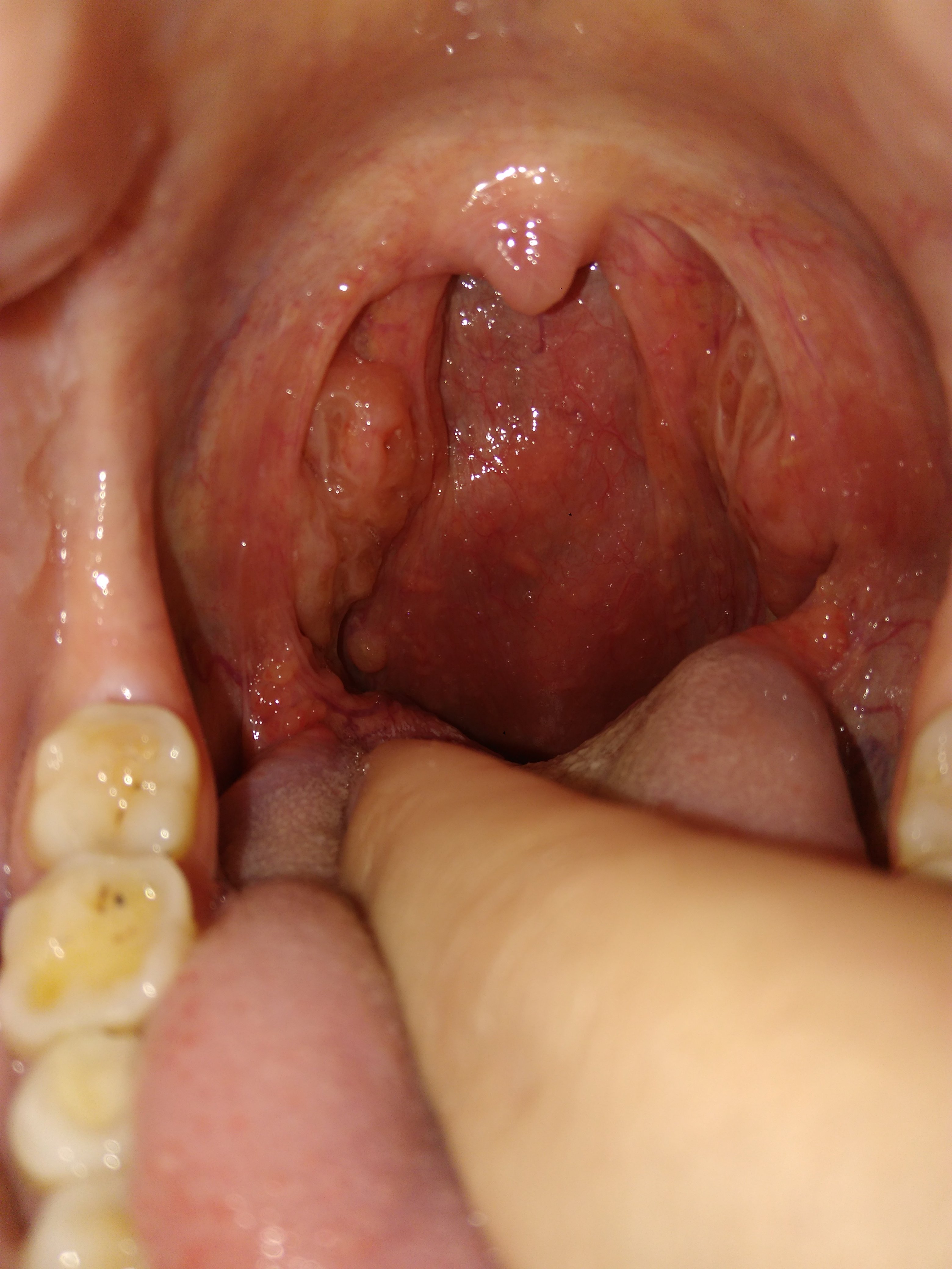 Появилась шишечка неделю-две назад, не болит. Горло не болит, температуры нет. Хроническая форма тонзиллита. подскажите что это, удалось рассмотреть только сегодня, к врачу смогу сходить только в четверг...