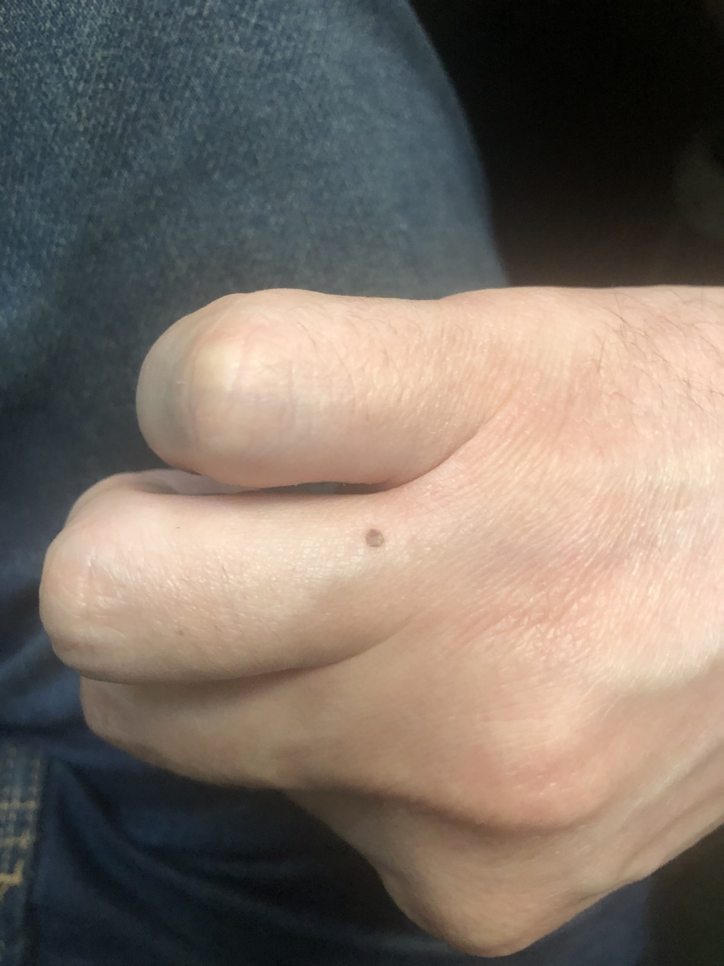 Здравствуйте, у моего партнёра выскочила маленькая черная точка на большом пальце руки, не зудит и не болит. Накручивает себя якобы у него рак кожи... Что это может быть? Прикрепила бы фото, но не знаю как.