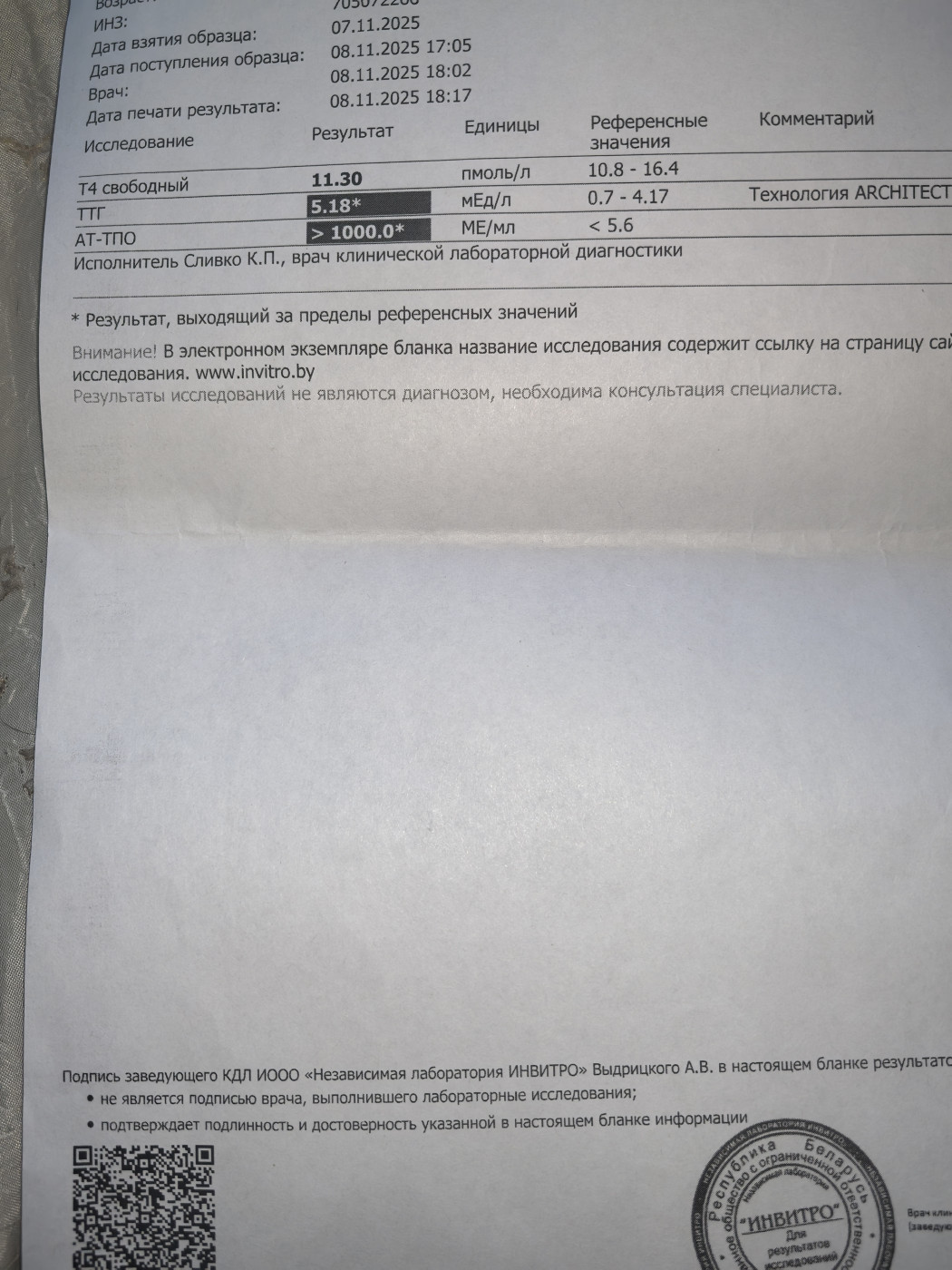 Назначили в августе пить (ттг был 4,93, атро 225.6) эутирокс 25 мг, сказали диагноз АИТ, пила 3 месяца, потом закончила, и в мае начала заново пить 50 мг. ( сама подняла дозировку, т.к. думала,что 25мг мало ,не проходили симптомы). К врачу не обращалась, ходила только в августе 1 раз. В конце мая сдала анализ - ттг 1,79. На протяжении года во всех… |