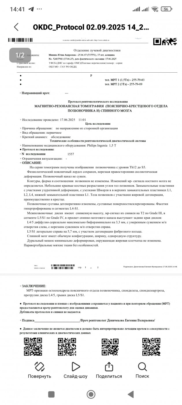 Заключение:МР картина дегенеративных изменений пояснично-крестцового отдела позвоночника.Грыжа межпозвоночного диска L5S1.Явления спондилоартроза!!!!Осложнение надо на левую ногу,отрафация левой ноги,Нога заметно сильно похудела.Положили на операцию!После операции прошло 8месяцев!Онемение по задней части… |