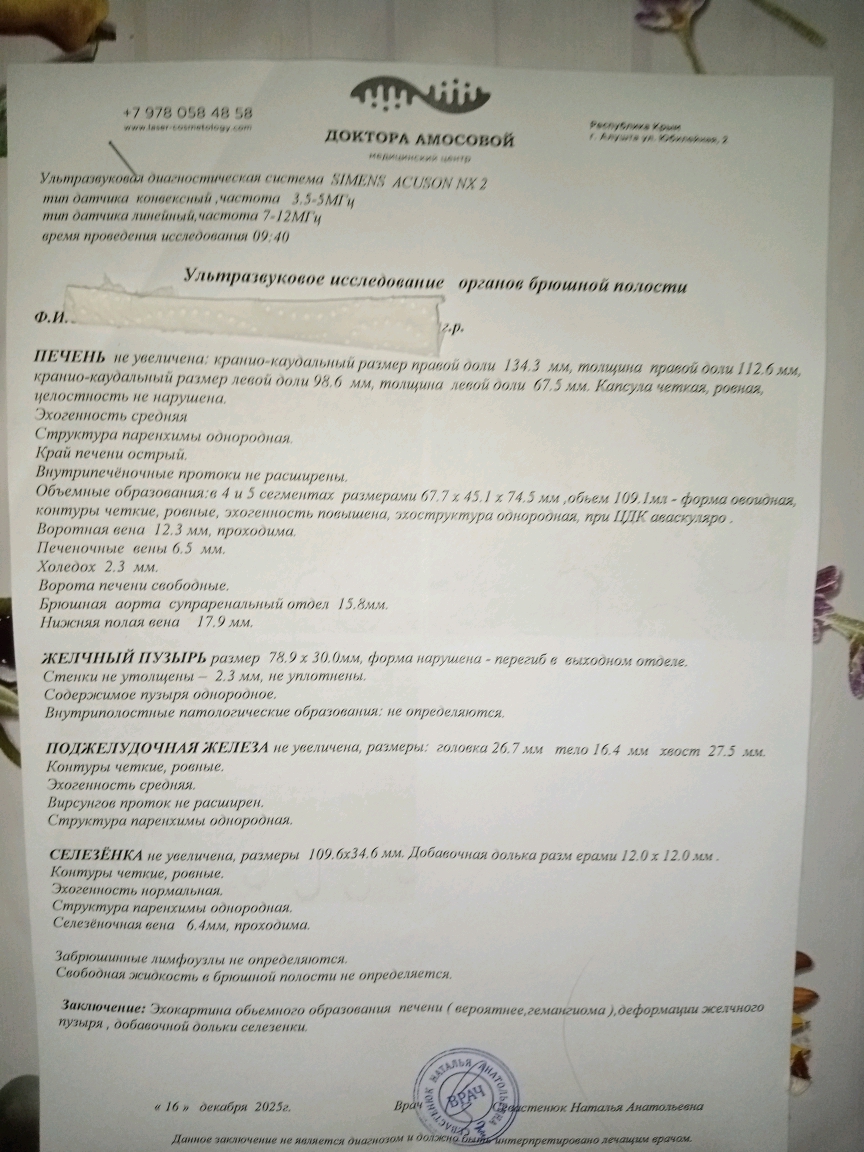 Заключение КТ: Гемангиома, множественные кисты печени.… |