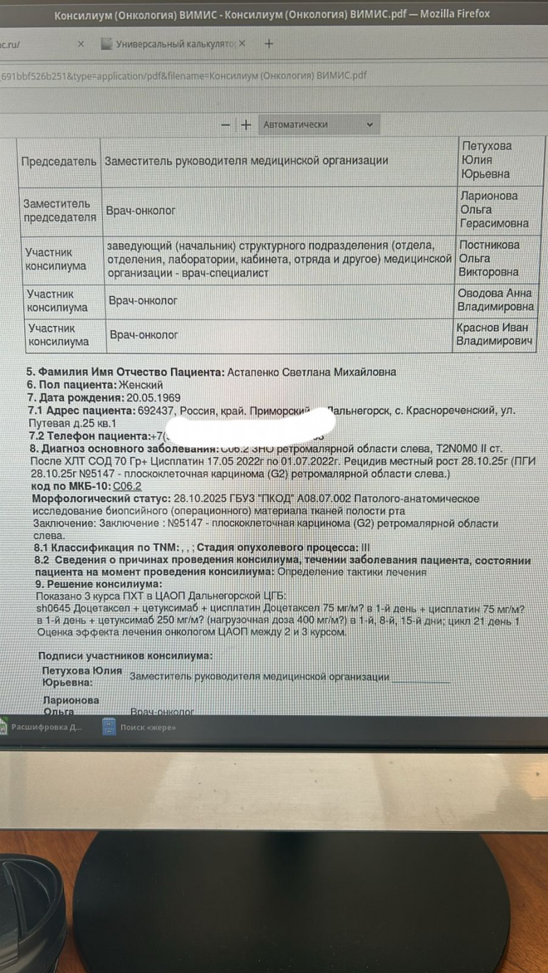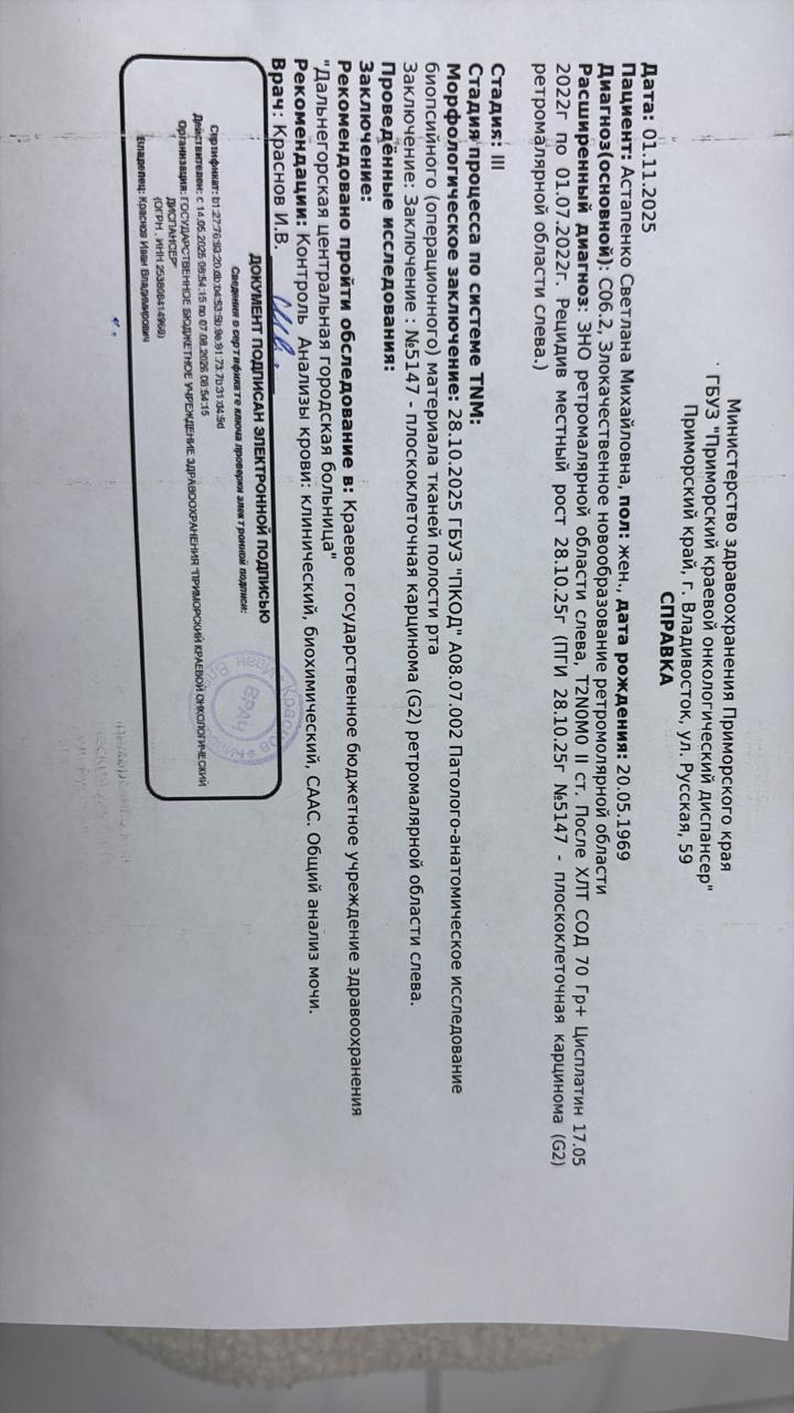 Онкология: нужна помощьДобрый день, меня зовут Светлана, я хотела бы попросить помощи, у меня плоскоклеточный рак, ниже прикреплю документы. Дело в том что пару лет назад делала лучевые, и все было хорошо, но сейчас рецидив, назначают химию, я очень сильно переживаю, так как есть еще проблемы с сердцем, обширный инфаркт где то год назад, на данный момент есть шунтирование. У нас город Дальнегорск, очень маленький и всего один онколог, некому обратиться за советом и консультацией. Я хочу повышать имуннитет, что бы все это выстоят. Может вы можете порекомендовать какие нибудь бады, или препараты ? И еще я сама недавно выписала Химохим, корейский бад, может вам что то известно, можно ли совмещать с химией терапией, и стоит ли его пить? И сок НОНИ советовали, что скажите ? Так же беспокоит сухость и боль во рту, может есть какое то средство мягкого действия? |