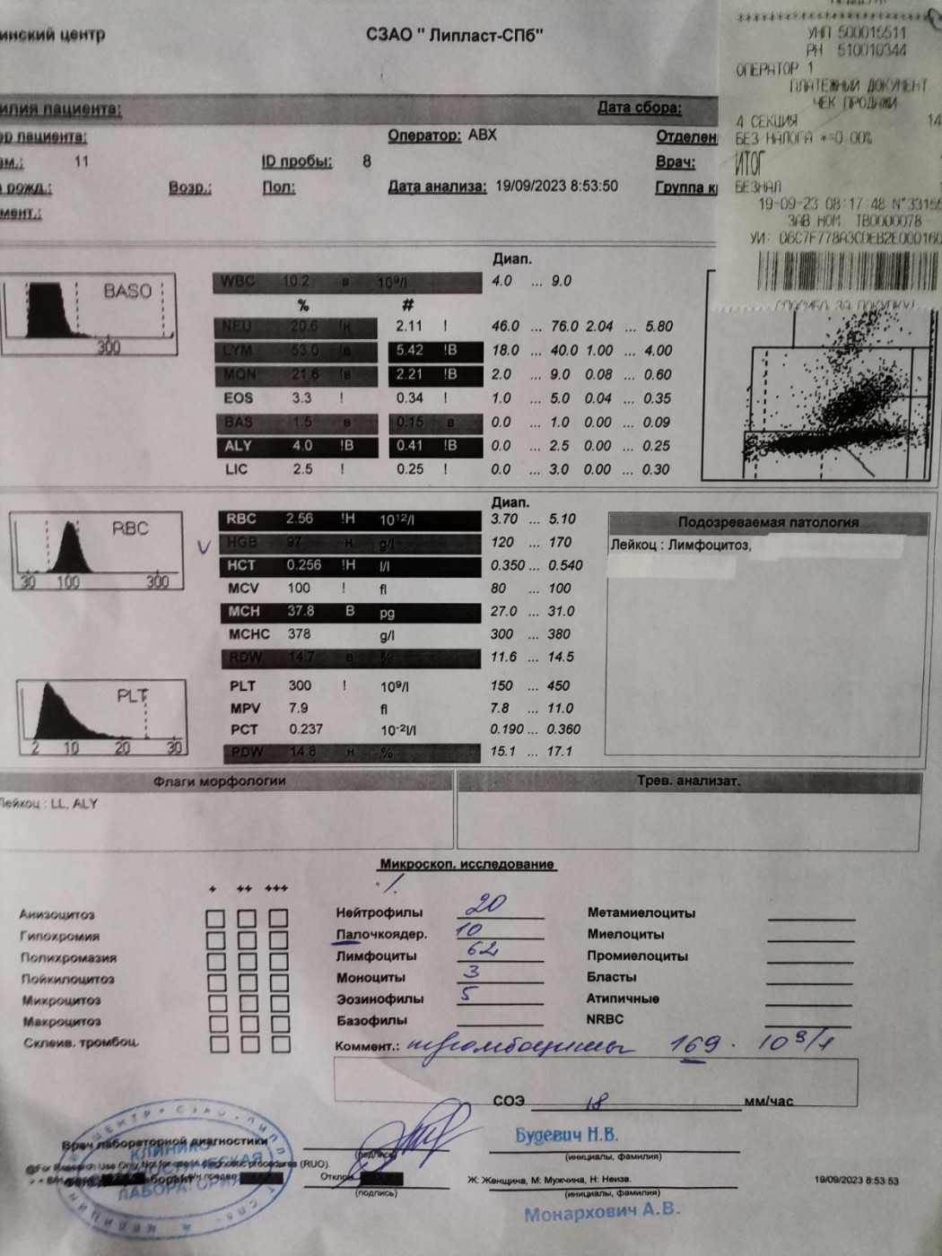 анализ кров. подскажите результаты анализа? wBc 11.8, RBC 4.49, HGB 10.1, HCT 36.1 , PLT 609, PCT 468, соэ 23 мм, к врачу попасть пока не можем. стоит переживать,? ребёнку 1. год.