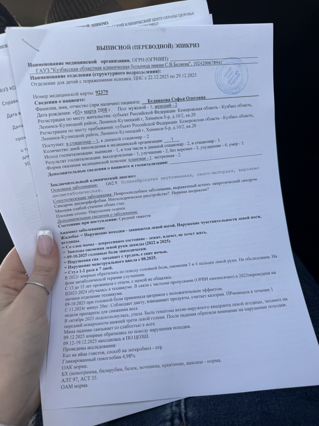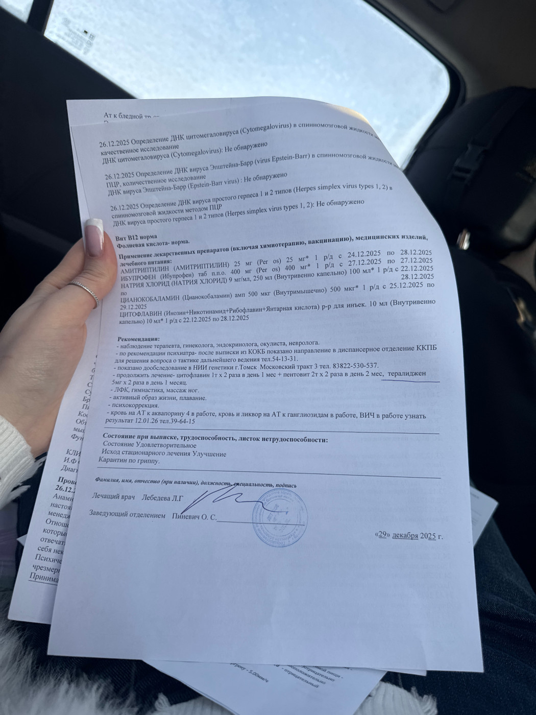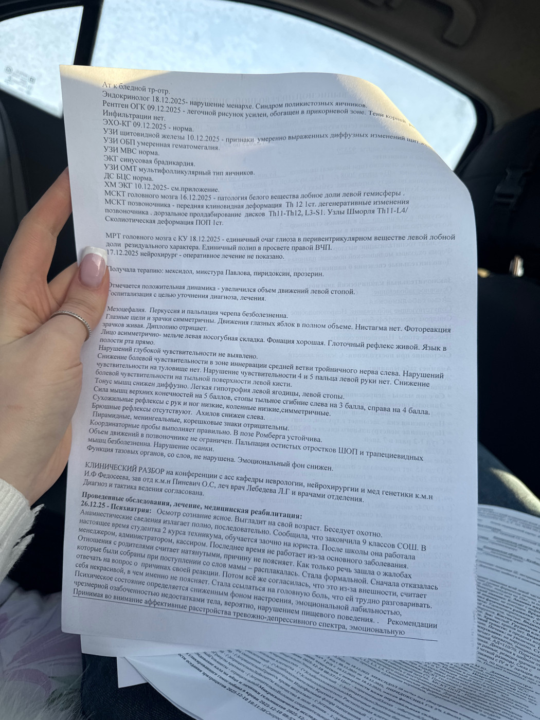 Подскажите пожалуйста как быть?Около 2-х месяцев назад я упала на левую ягодицу,у меня начала неметь левая нога ,около месяца я плела ее за собой,потом начала чувствовать как будто левая часть тела немеет,как будто она не моя,затекало тело,падания,потом поняла что не чувствую мышцы по левой стороне,потом уже и как во всем теле,прошла обследование (фото прикреплю)по сути никакого лечения не назначено(фото прикрепила),у меня нет сил от слова совсем,мышцы не работают во всем теле,трудно даже сидеть,подскажите что делать? |