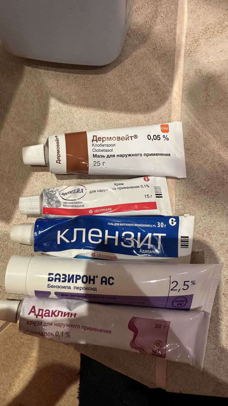 Покраснения и высыпания на лицеДоброго времени суток, мне 21 год, беспокоит высыпания на лице и покраснения. Покраснения лбу и щеках становятся сильнее после душа и после прогулки при сильном холоде. Когда умываюсь с мылом или специальным гелем для умывания начинает сильно шелушиться все лицо. Летом в солнечные дни при прогулке лицо быстро становиться жирным и блестящим. Высыпания остаются примерно на одном уровне в течение 3 лет. Раннее лет 6 назад был дерматит в области сгибания локтей и под коленками. Сейчас только на лице высыпания. Обращался к дерматологам мне выписывали мази как на фото, я использовал их, но эффекта нет. По питанию ограничений нет, сладким и сдобным не злоупотребляю. Подскажите пожалуйста как вылечить высыпания на лице и убрать покраснения на лице? |