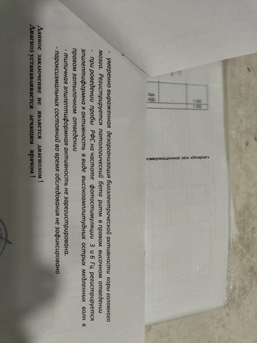 Заключение ээг:умеренные диффузные изменения бэа головного мозга, дисфункции подкорковостволовых структур.Реактивность БЭА при проведении функциональных проб выражена. При ритмической фотостимуляции зарегистрирован эпизод пароксизмальной активности эпилептиформного зарактера в виде билатерально-синхронных вспышек острых, медленных волн амплитудой до… |