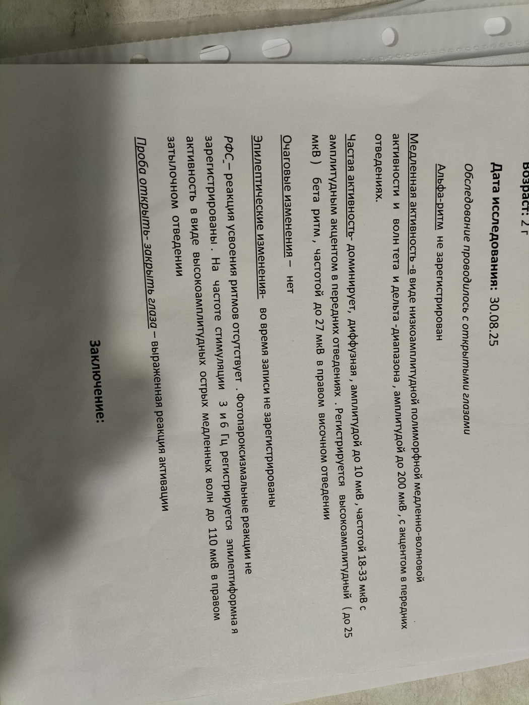 Ребёнку 6 лет,в ноябре будет 7 лет. Заключение ЭЭГ: Общемозговые изменения с признаками дисфункции срединно-стволовых структур дизрегуляторного характера за счёт полиморфности биоэлектрической активности,высокого удельного веса медленных форм активности диффузно. Межполушарная асимметрия за счет заостренных и медленных волн (в том числе дельта-диапазона)… |