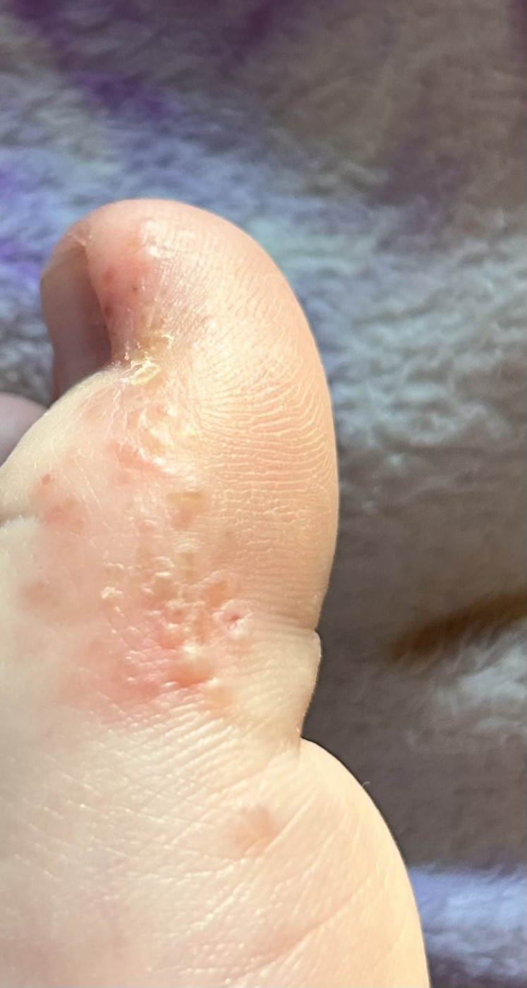 Летом на стопах сверху в основании пальцев ног образуются маленькие водянистые прыщики, со временем они лопнули(когда чесались, случайно повредил несколько) на их месте образовались небольшие ранки. В мест большого скопления ранок образовалось локальное |