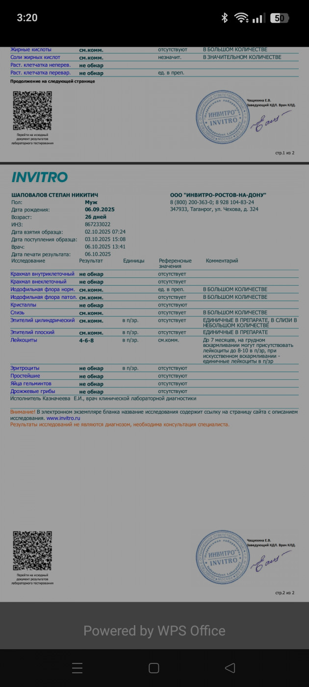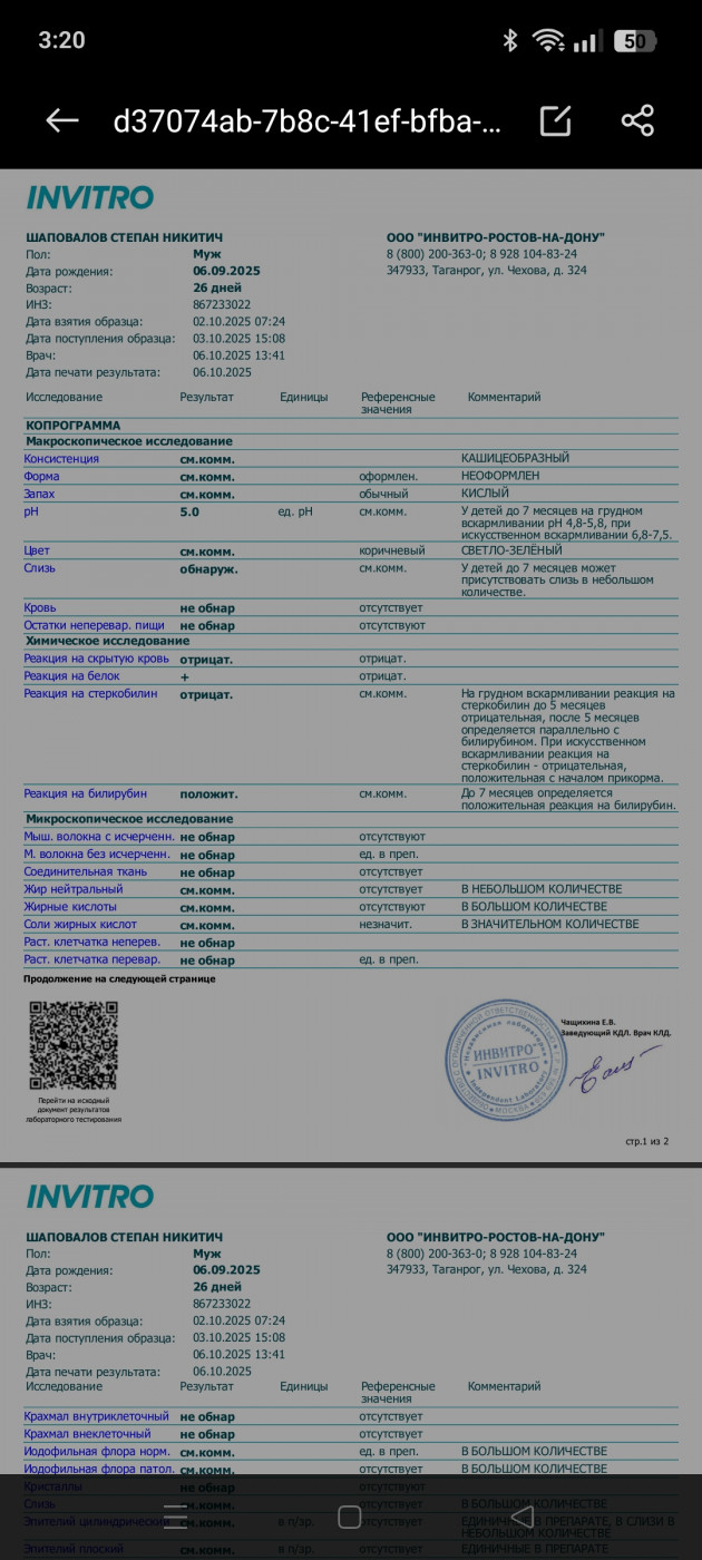 Проблемы с животиком у месячного ребенкаМалышу ровно месяц, недели две назад начались сильные проблемы с животиком, то запоры, то жидко, сильные газы, урчание, постоянные беспокойства, плачь, поджимает ножки, стул пах кислым и 70% впитывал подгузник, оставались какие то «крупинки» Давали аципол малыш и боботик, помогло не сильно, в один момент обнаружили прожилки крови в кале, сдали копрограмму, стали давать на свой страх и риск лактазар, ситуация изменилась, но кал все равно жидкий, малыш стал спокойней, газы отходят легче, но теперь требуется расшифровка анализа, заранее спасибо за ответ |