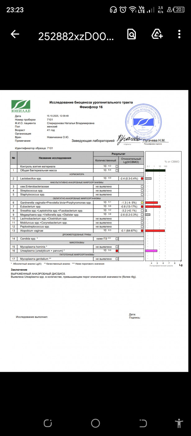 Посев на Ureaplasma spp. >10 в 4 степени КОЕ/мл