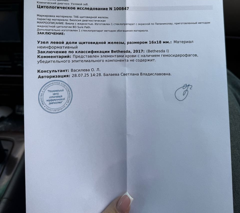 Помогите расшифровать результатПодскажите, пожалуйста, необходимо проводить повторную биопсию? Узел кистозно-солидный, на узи в мае был 36х23х19 мм, при взятии пункции стал меньше, визуально опухоль прошла, эхогенность и контуры узла не описаны по узи, образование аваскулярное, анализы на гормоны нормальные, общий анализ крови тоже, цветовой показатель крови чуть ниже нормы и мелкие эритроциты. Анализ на кальцитонин хороший. беспокоит слабость, ферритин 18, витамин Д 10,1 |