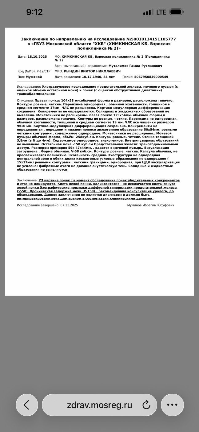 Здравствуйте. Камни не выявлены, выявлена киста левой почки, увеличена предстательная железа. |
