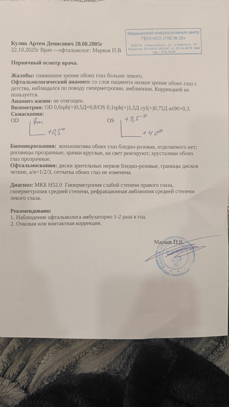Расшифруйте результаты обследованияПол мужской, 20 лет. С детства плохое зрения глаз, в частного правый видит до 7 строчки а левый только первую и то размыто. Ставят диагнозы гиперметропию и амблиопию с детства, сейчас прохожу обследования для военкомата подскажите есть ли шанс с таким зрением как у меня не идти в армию и какую категорию я могу получить по зрению. Заранее спасибо |