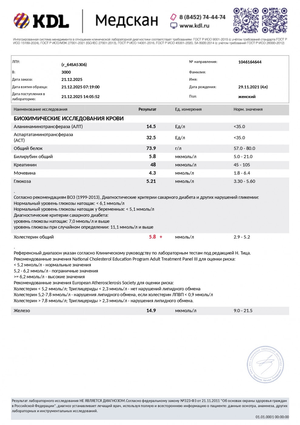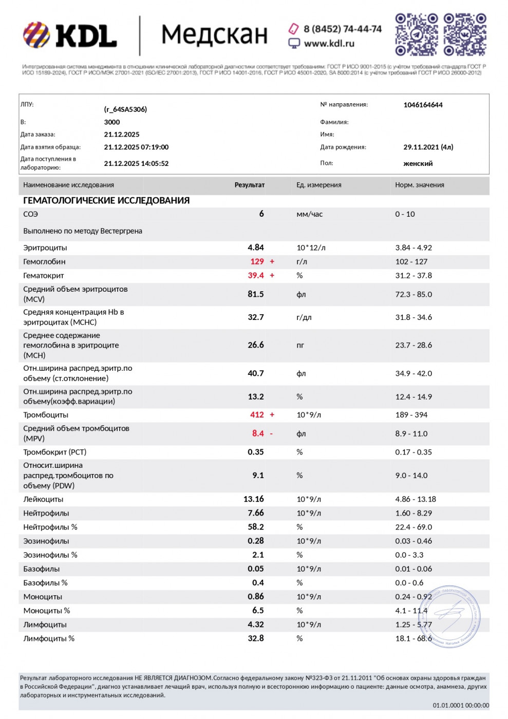 Может ли это быть последствием перенесённого заболевания?Добрый день! Моей дочке 4 годика. Болела на протяжении 1,5 недель, высокая температура, насморк, горло. Выздоровела в середине текущей недели. Вчера и сегодня показалась бледной. Сегодня сдали дали анализы в лаборатории. По некоторым показателям есть отклонения от нормы. Результаты прилагаю. Пожалуйста, подскажите: |