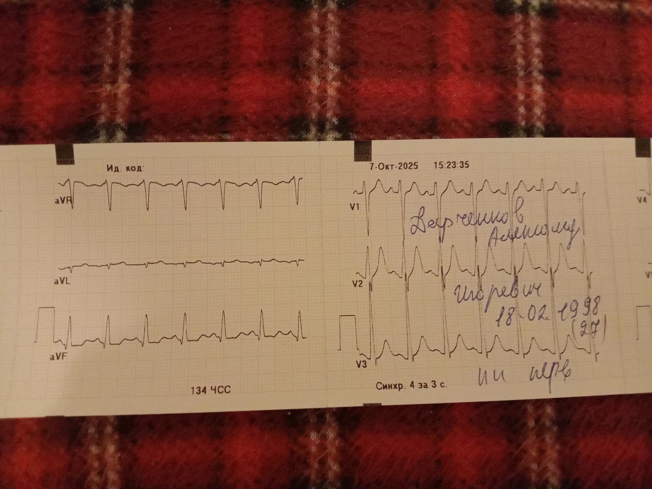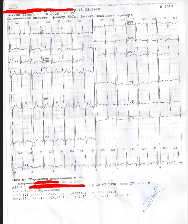 Результаты ЭКГЯ вам ранее писал вопрос что в поликлинике на ЭКГ увидели подозрение на инфаркт, вот я во вторник побывал в больнице там все ислледования посмотрели и сказали что нет никакого инфаркта, там они сняли ЭКГ повторно в больнице сказали что все нормально, только пульс частит у вас из-за психоэмоционального состояния да при ЭКГ он до 134 поднялся к тому же я пока шел в больницу запыхался. Придя домой посмотрел распечатку ЭКГ и ужаснулся увидел в заключение QT308 мс/ QTc 459 мс ведь 459 это удлинение, почему врачи мне ничего сказали а сказали что все нормально. Я в интернете вычитал что мог быть произведен подсчет с помощью формулы Баззета а при выском пульсе а у меня он был 134 на момент ЭКГ он мог не корректно удлинится по этой формуле, однако я точно ничего не знаю сам что делать, я записан к кардиологу но на 20 октября далеко не страшно ли ждать столько? Я приложу это ЭКГ. Я находил в интернете калькулятор рассчета интервала QTс там нужно ввести QT и чсс по одной из формул Framingham которая при пульсе выше 100 применяется QTc вышел 393 мс но к сожалению пока врач не посмотрит и не скажет точно меня будет приследовать страх теперь. |
