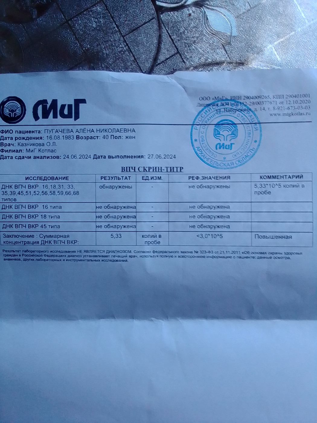 Объясните, что означает результат исследования на ВПЧ?Здравствуйте, сдавала ВПЧ мазок,там много чего обнаружено и повышенная суммарная концентрация. Это рак? |