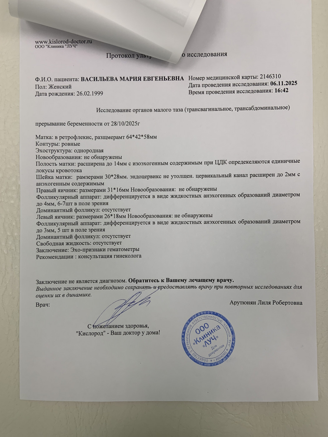 Сгустки после аборта28 октября был вакуумный аборт, выделения закончились на следующий день. 6 ноября пошли коричневые небольшие выделения температура 37-37,5 по узи сгустки крови с кровотоком. Проколола три укола окситоцина пока результатов нет |