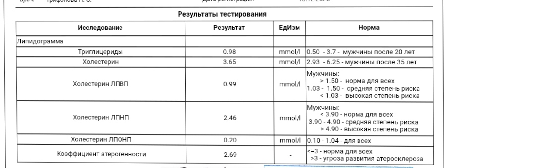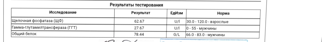 ПЦР - отрицательный, АлАТ - 43, АсАТ - 28, Билирубин общий - 12,7, Билирубин прямой - 4,4, Билирубин непрямой - 8,3, кроме того, Глюкоза 6,2, Холестерин - 7,29, Холестерин-ЛПНП (по Фридвальду) - 5,09, Коэффициент атерогенности… |