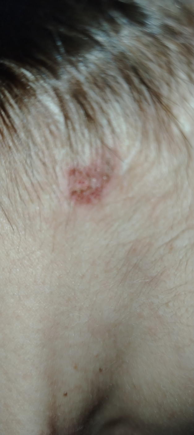 Странное пятно на ногеПри том,как потрогаешь его,зудит.Красное, как будто пузырьков много маленьких, в середине белое пятно |