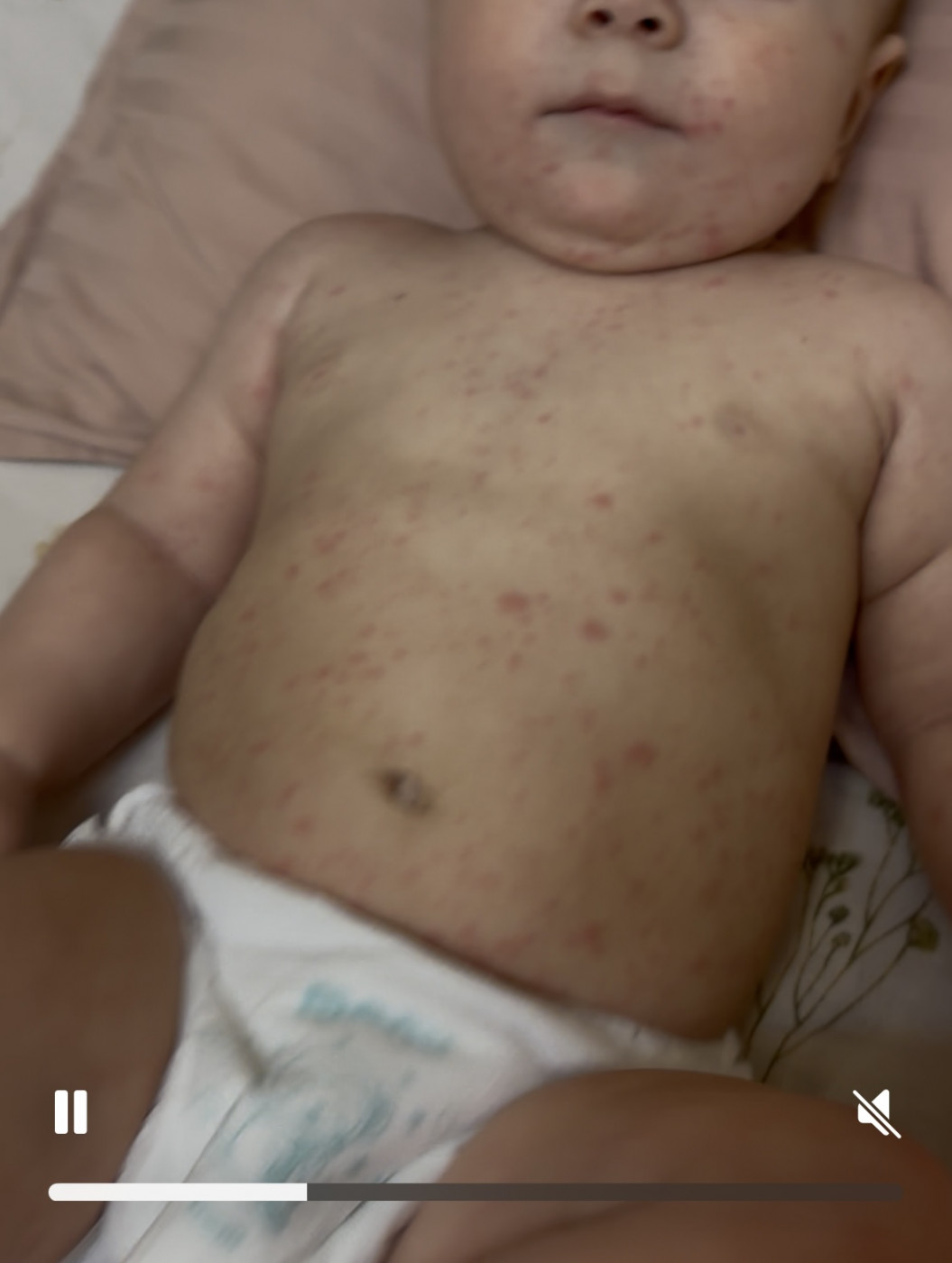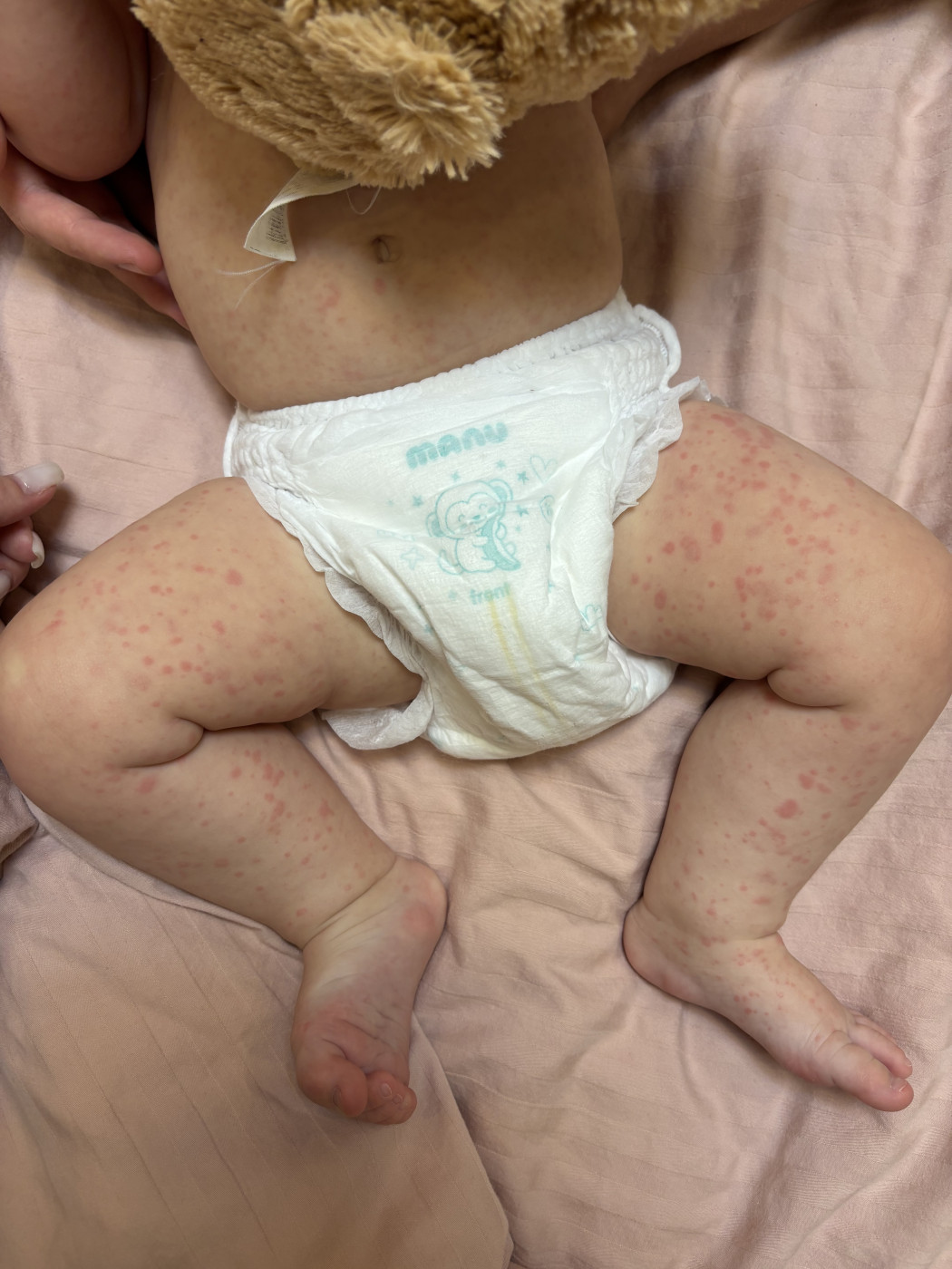 | 👍 0 👎 | Сыпь по всему телу у 7месячного ребенкаМальчик 7мес. Все началось с температуры 25 октября. И параллельно аллергия( после антигистаминного прошла) пососал первый раз яблоко в этот день. Температура доходила до 39,4. В первые дни тяжело снижалась. С 27 октября появился понос жидкий зелёный. 28 октября нормализовалась температура.Было чуть красноватое горлышко еще доктор говорил. |