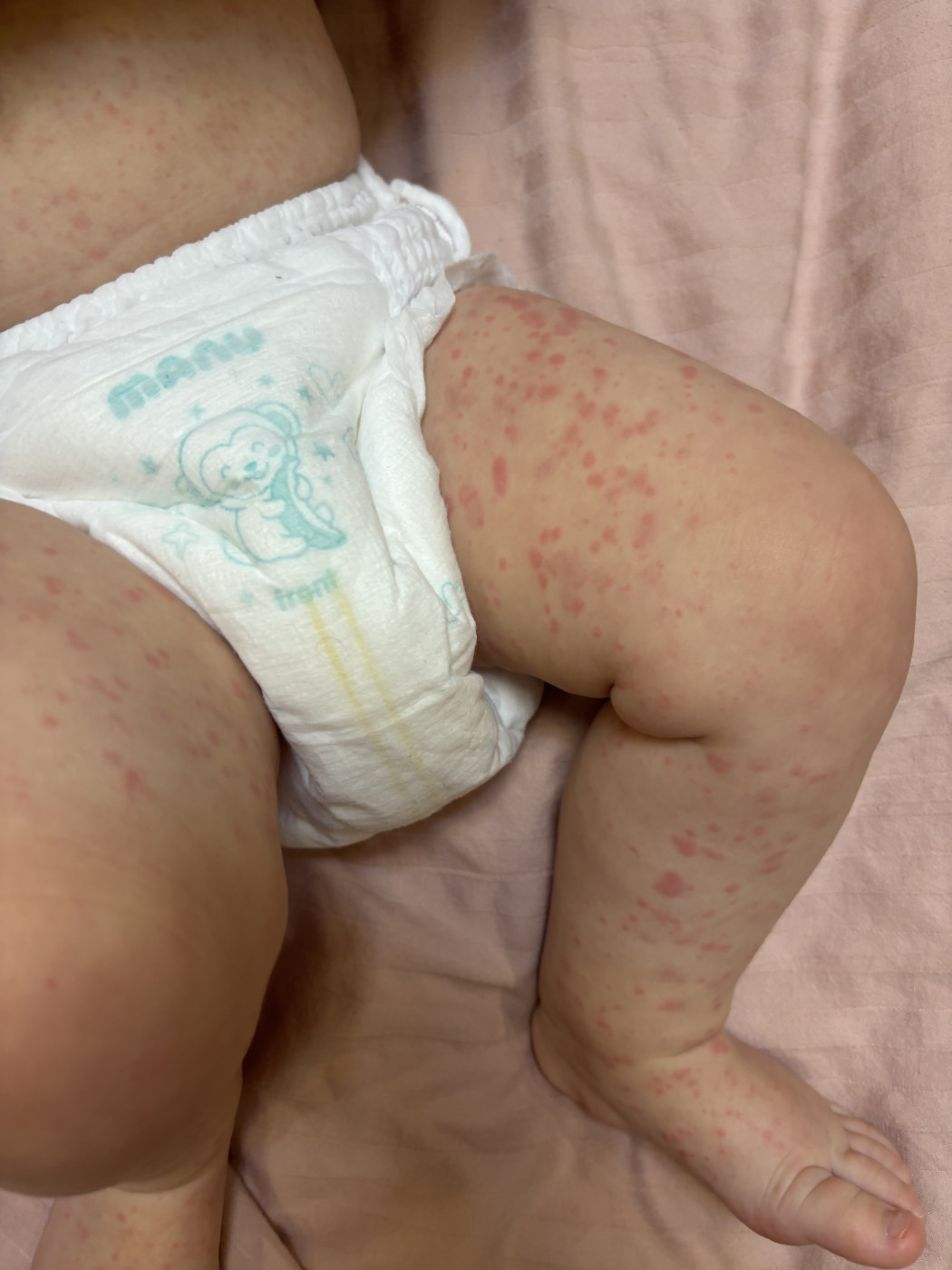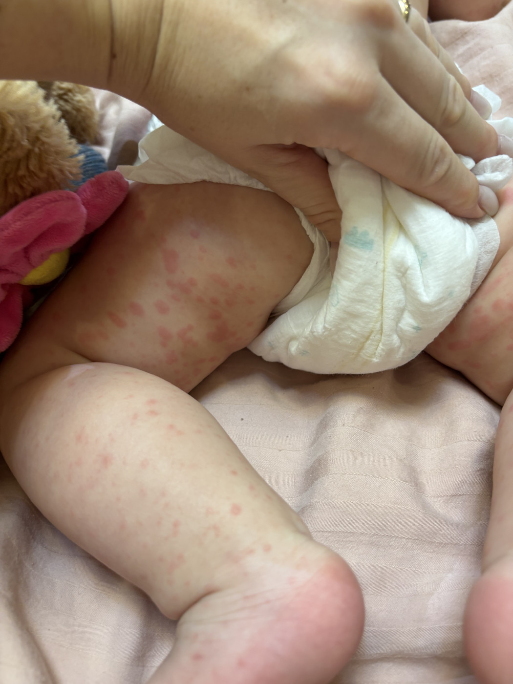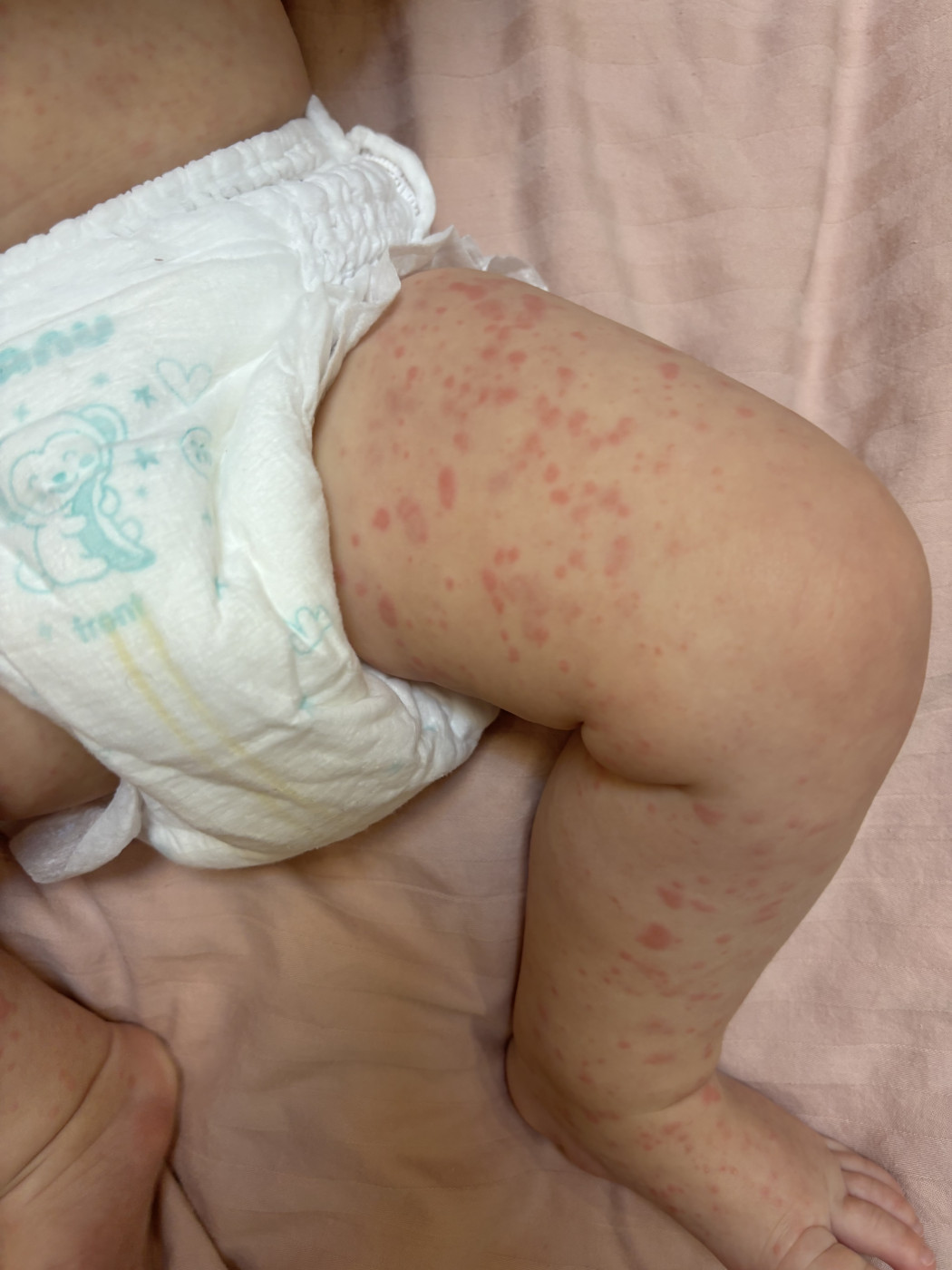 | 👍 −1 👎 | Красная сыпь на ногах у ребенка   у ребёнка на внутренней стороне бедер участками красные высыпания как крапивница, уже 2недели, пили супрастин не помогло,мазали кремом гистан,не уменьшается. подгузники не носим,были высыпания на щеке почти прошли.что это может быть и как помочь? |