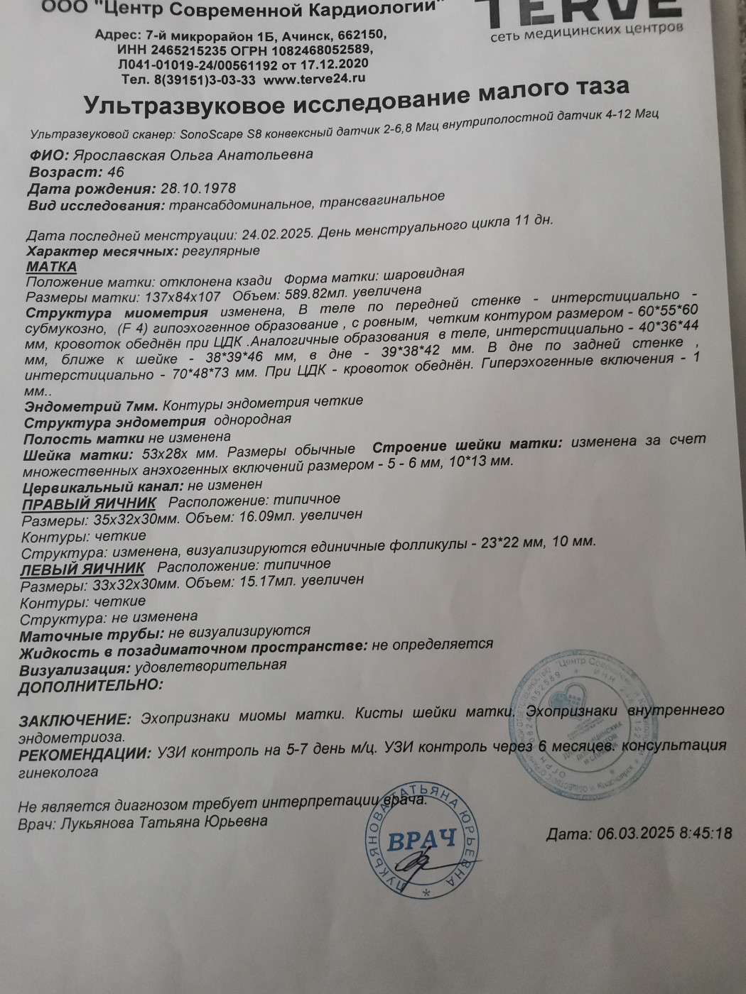 Три месяца назад поставили диагноз миома матки (78 мм). До этого шесть месяцев назад выявили снижение гемоглобина до 76 (оказывается, он снижался постепенно в течение трех лет). После приема лекарств все пришло в норму, и уже как пять месяцев результат по гемоглобину нормальный.… |